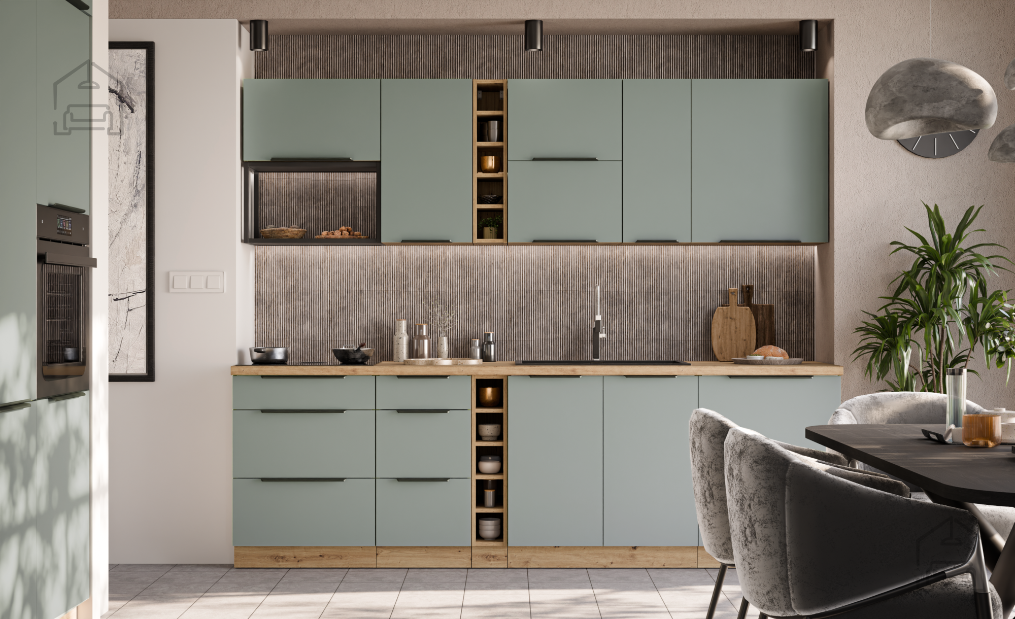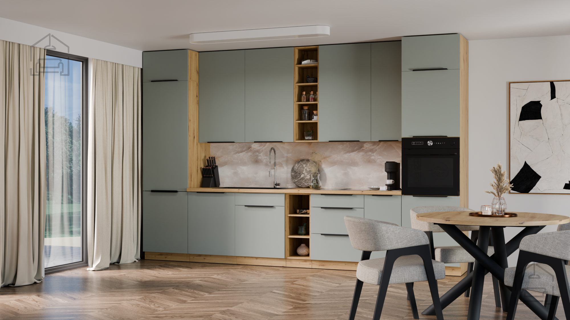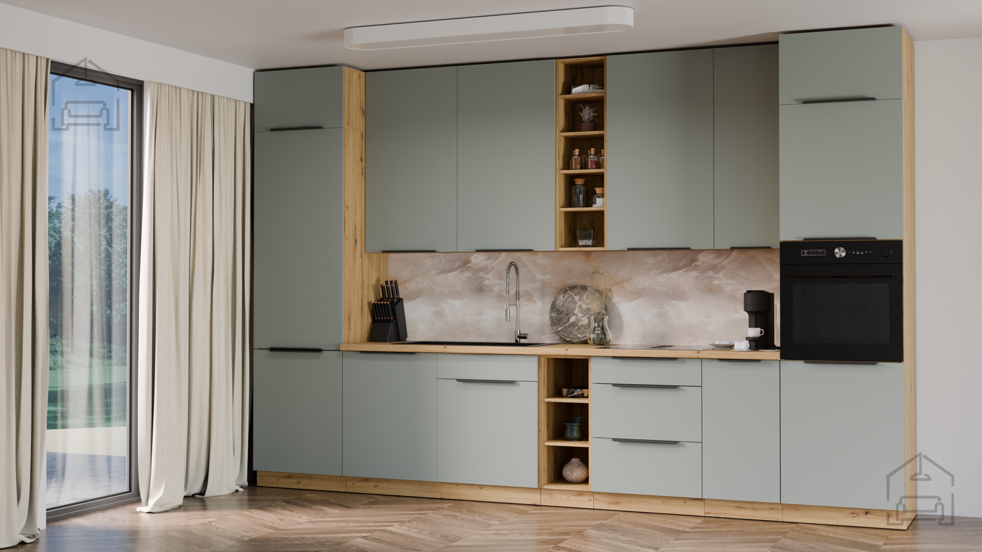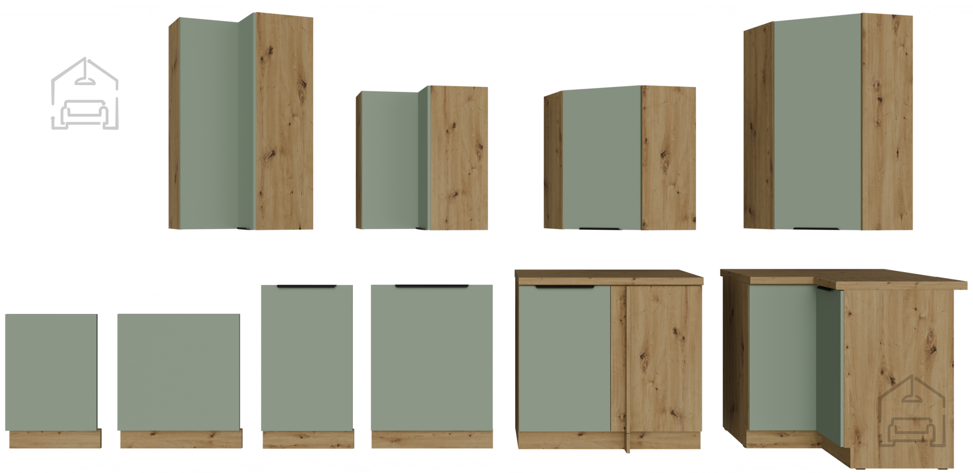 Die Farbe des Produkts – Grün in Kombination mit dem Holzton der Artisan-Eiche – bringt ein Gefühl von Natürlichkeit und Frische in den Raum. Eine solche Farbkombination wirkt beruhigend und passt hervorragend zu verschiedenen Einrichtungsstilen, von minimalistischen bis hin zu klassischen Küchen. Das Set Aria kann mit verschiedenen Haushaltsgeräten und Zubehörteilen ergänzt werden, was die Schaffung eines individuell angepassten Ambientes ermöglicht.
