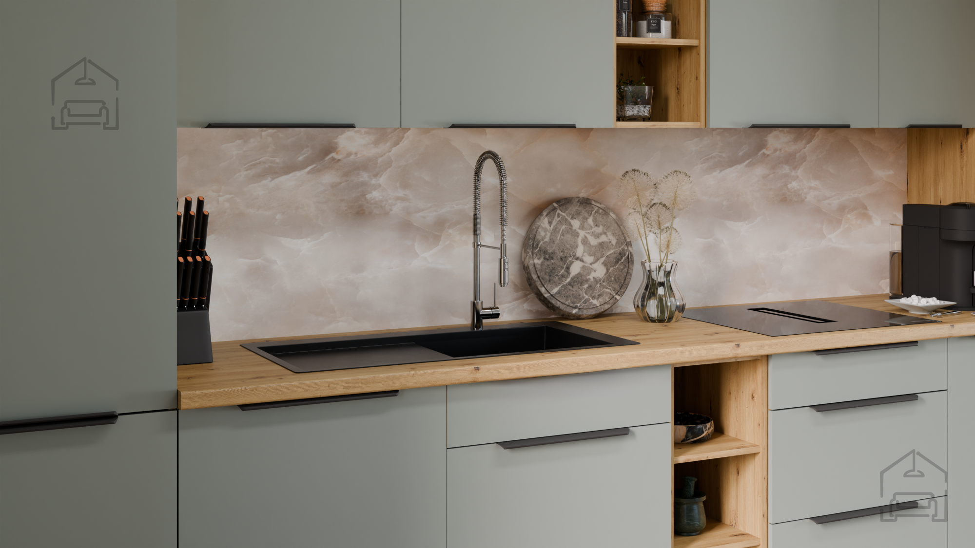 Die Arbeitsplatte des Modells Aria ist im Dekor 38-6499 Marmor Roma ausgeführt, das mit seiner natürlichen Textur und dem hellen Ton den Farbkontrast des gesamten Sets ergänzt. Die Oberfläche ist beständig gegen mechanische Belastungen und Temperaturschwankungen, was eine unbeschwerte Zubereitung von Speisen ermöglicht. Die Kombination des marmornen Erscheinungsbilds mit dem Holzdekor der Artisan-Eiche schafft ein harmonisches und modernes Aussehen der Küche.
