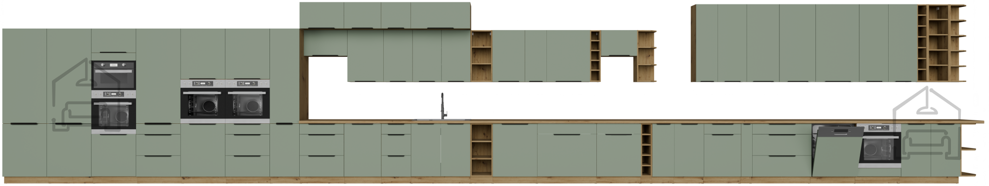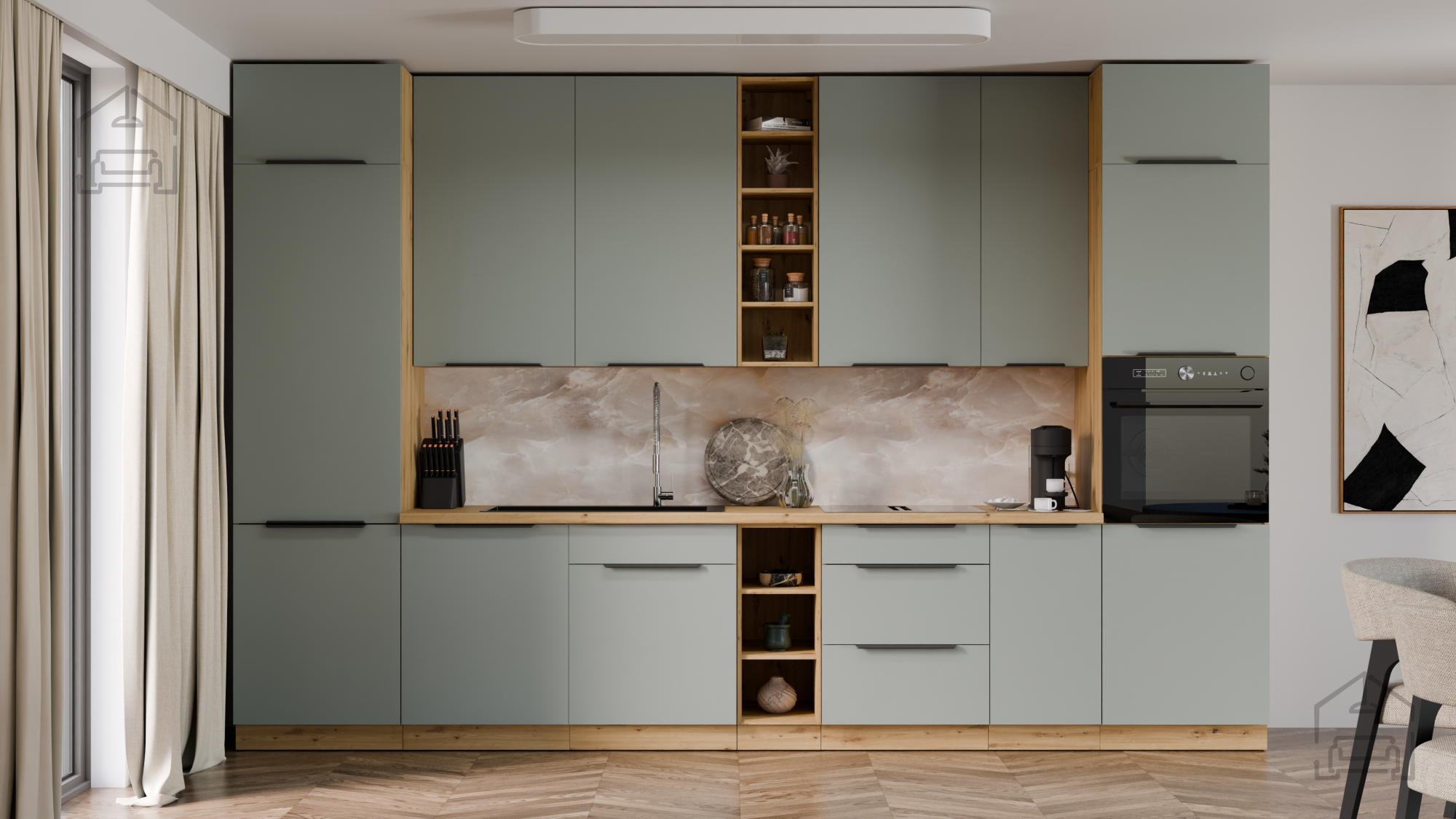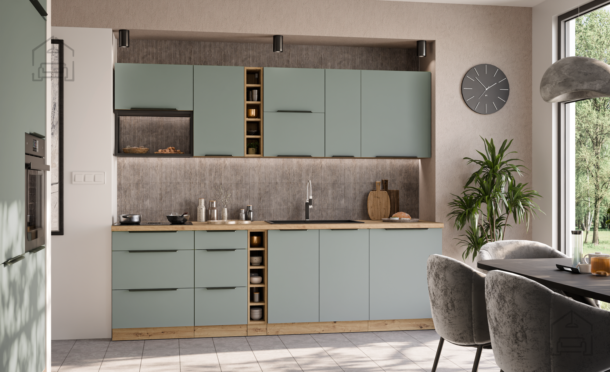 Der Rahmen der Küchenelemente besteht aus dem Material Iveral, das Festigkeit und Stabilität der Konstruktion gewährleistet. Das Design ohne ausziehbaren Tisch ermöglicht eine perfekte Anpassung an verschiedene Grundrisse und bewahrt gleichzeitig klare Linien und eine kompakte Form. Das gesamte Set ist mit Blick auf eine funktionale Anordnung konzipiert, die eine effiziente Raumnutzung und einen einfachen Zugang zu allen Küchenelementen ermöglicht.