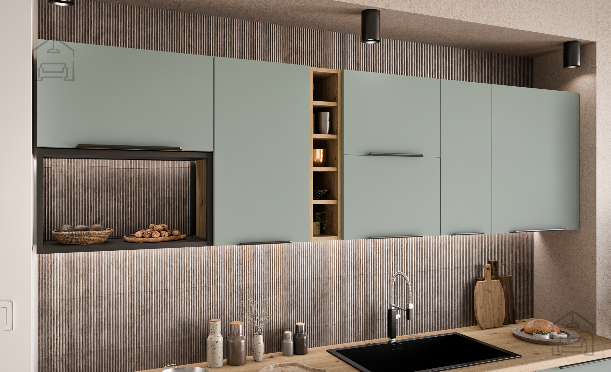 Alle Elemente der Küchenzeile Aria werden mit hoher Präzision gefertigt, was die Stabilität der Konstruktion und eine lange Lebensdauer gewährleistet. Eingebaute Soft-Close-Systeme für Fronten und Schubladen ermöglichen ein sanftes und geräuschloses Schließen von Türen und Schubladen, was den Bedienkomfort erhöht und Beschädigungen der Kanten verhindert. Ein solches System trägt auch zur längeren Haltbarkeit der Möbel und zur Erhaltung des ästhetischen Erscheinungsbilds bei.