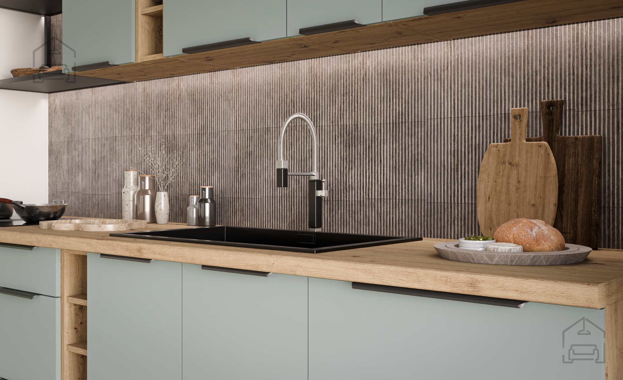 Die Basis der Küchenzeile Aria ist eine laminierte Platte mit einer Stärke von 16 mm, die für ihre Beständigkeit gegen Kratzer, Feuchtigkeit und Hitze bekannt ist. Die Oberfläche ist leicht zu reinigen, was eine unbeschwerte Zubereitung von Speisen und die Erhaltung eines perfekten Aussehens im Laufe der Zeit ermöglicht. Die Farbkombination aus Aquamarine und Artisan-Eiche schafft ein angenehmes Gleichgewicht zwischen einem modernen frischen Ton und der Wärme des Holzes. Dieser Kontrast verleiht der Küche einen markanten Charakter und ermöglicht eine einfache Abstimmung mit anderen Einrichtungselementen.