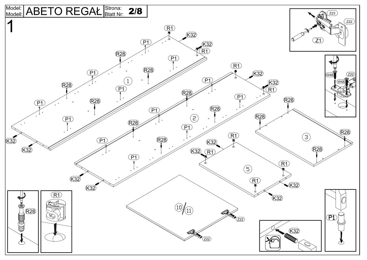 Alle Kanten sind mit einem 0,45 mm ABS-Streifen versehen, der die Stoßfestigkeit erhöht und das Material vor Absplitterungen schützt. Diese Verarbeitung verlängert die Lebensdauer des Möbels und bewahrt sein gepflegtes Aussehen auch nach vielen Jahren. Das Regal steht auf schwarzen Kunststofffüßen, die für Stabilität sorgen und den Bodenbelag schonen.