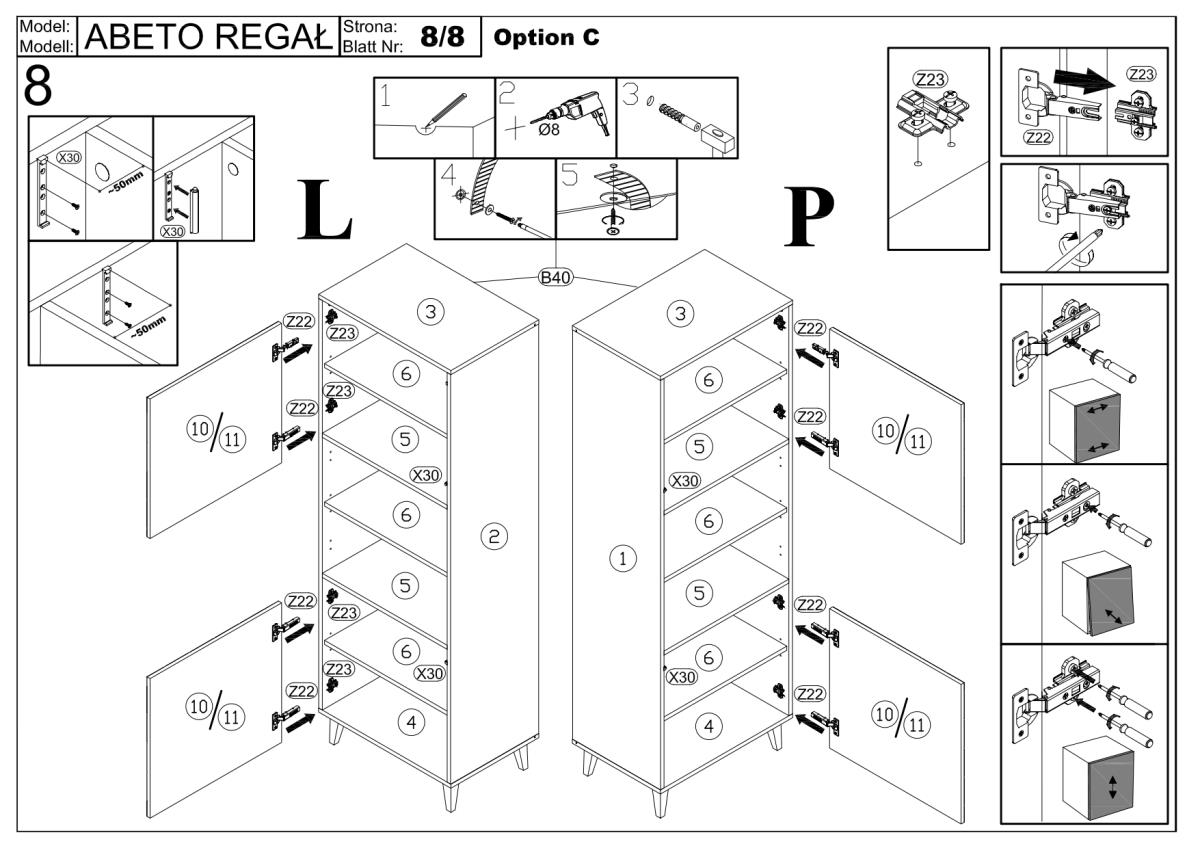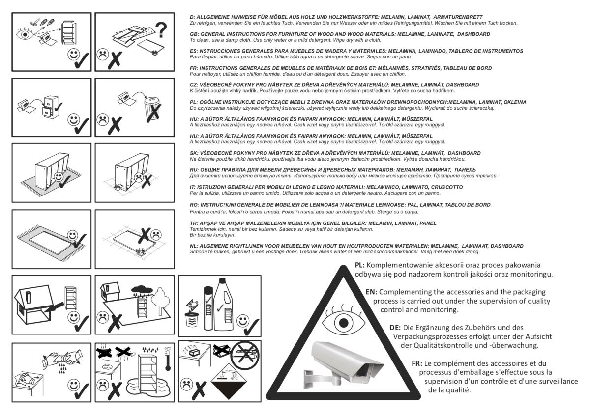 Die verwendeten Materialien ermöglichen eine einfache Reinigung – ein feuchtes, weiches Tuch genügt. Die laminierte Oberfläche und die PVC-Folie schützen vor Flecken und erleichtern die tägliche Pflege. Dank der robusten Konstruktion und soliden Verbindungen ist das Regal eine dauerhafte Lösung für jedes Zuhause, die Design und Funktionalität vereint.