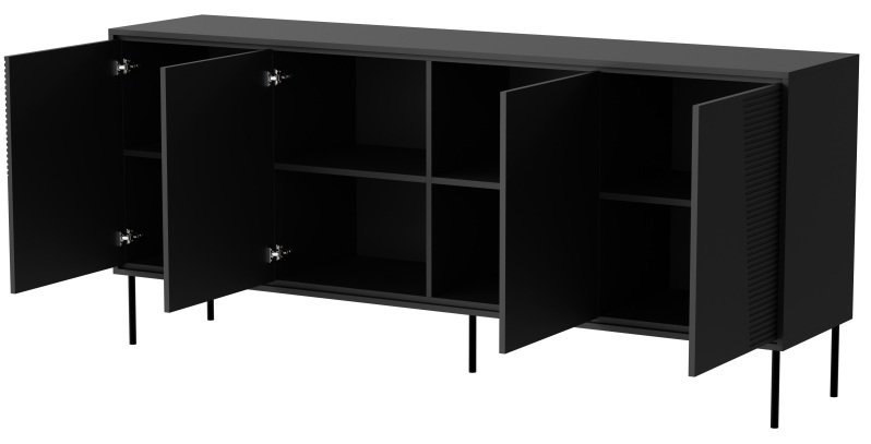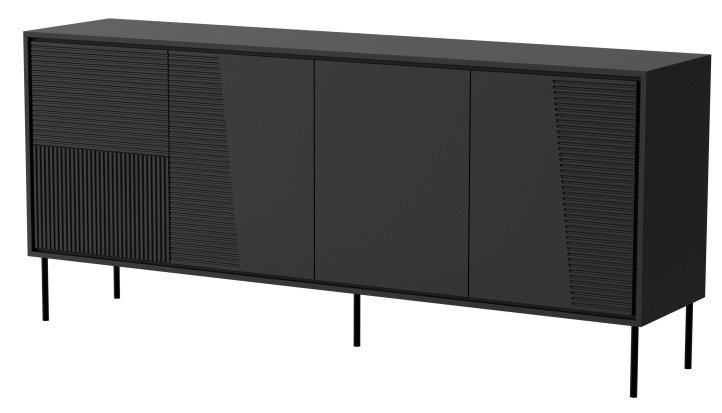 Die Kommode Abi ist für Benutzer konzipiert, die Ordnung und Ästhetik schätzen. Ihr Innenraum bietet ausreichend Stauraum für Kleidung, Dokumente, Geschirr oder andere Alltagsgegenstände. Mit ihrer Breite von 200 cm eignet sie sich zur Platzierung unter dem Fernseher, an der Wohnzimmerwand oder als Ergänzung zu einem Schlafzimmer-Set. Die Oberfläche der Kommode ist groß genug, um dekorative Elemente wie Bilderrahmen, Lampen oder Pflanzen darauf auszustellen. Die glänzende schwarze Außenverarbeitung wird jedes Detail im Raum hervorragend betonen.