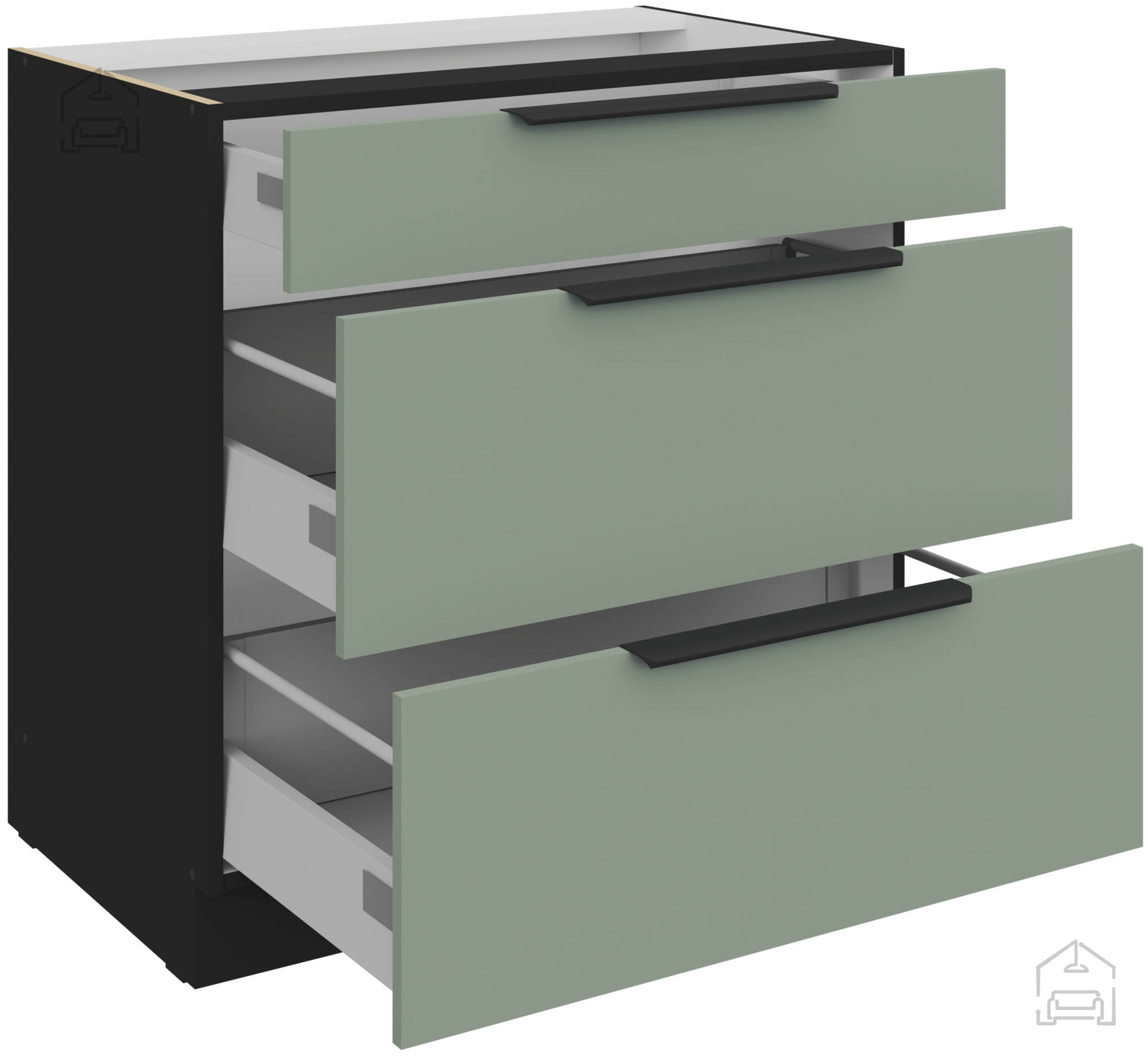 Die laminierte Oberfläche ist flecken‑, wasser‑ und teilweise mechanisch widerstandsfähig, wodurch die Küche Aria leicht zu reinigen ist. Ein weiches Tuch und ein mildes Reinigungsmittel genügen. Die Kanten der Elemente sind präzise verarbeitet, um das Eindringen von Feuchtigkeit zu verhindern und die Lebensdauer zu verlängern. Dank der Systeme für sanftes Schließen und der hochwertigen Beschläge behält die Küche ihre Funktionalität und ihr Erscheinungsbild auch bei intensiver täglicher Nutzung lange bei.