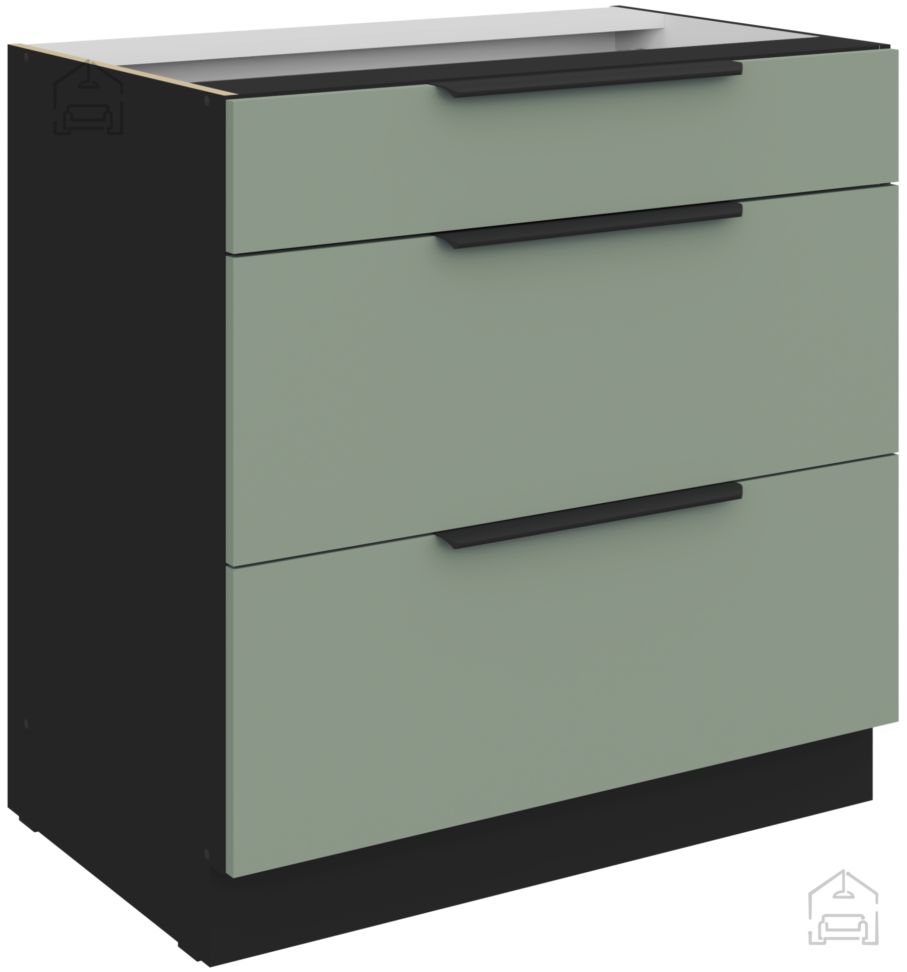 Die Arbeitsplatte mit der Bezeichnung 38‑6499 Marmor Roma sorgt für einen eleganten Abschluss des Ganzen. Das Marmormuster harmoniert schön mit den farbigen Fronten und verleiht einen Hauch von Prestige. Die Oberfläche ist feuchtigkeitsbeständig und leicht zu reinigen, was eine unbeschwerte Zubereitung von Speisen ermöglicht. Die Küchenelemente sind mit ästhetisch und praktisch gestalteten Griffen Edge UA‑HEXA aus schwarz‑aluminiumhaltiger Legierung ausgestattet. Die Griffe sind in verschiedenen Abständen erhältlich – von 64 mm bis 320 mm – wodurch sie mit unterschiedlichen Tür- und Schubladengrößen kompatibel sind.