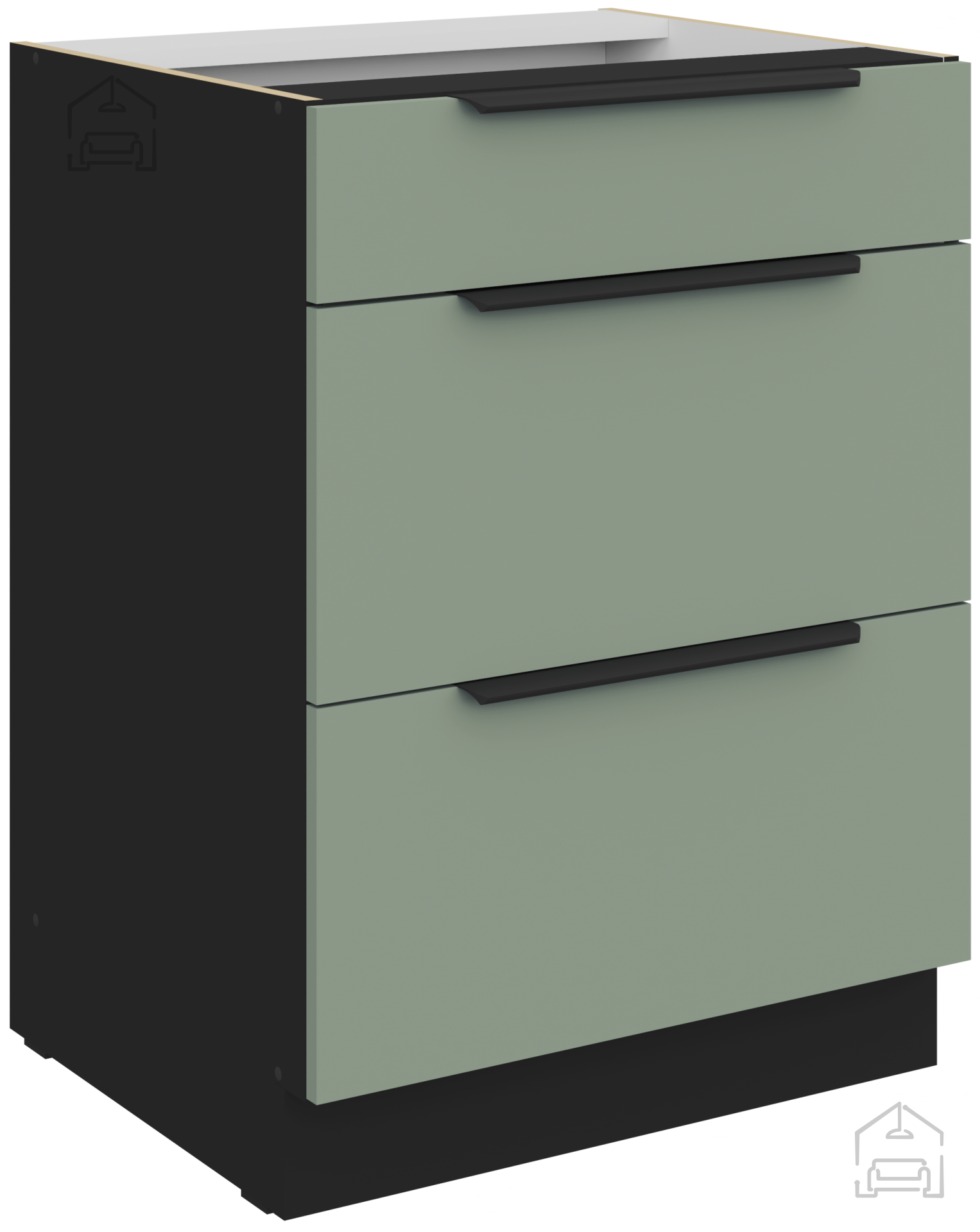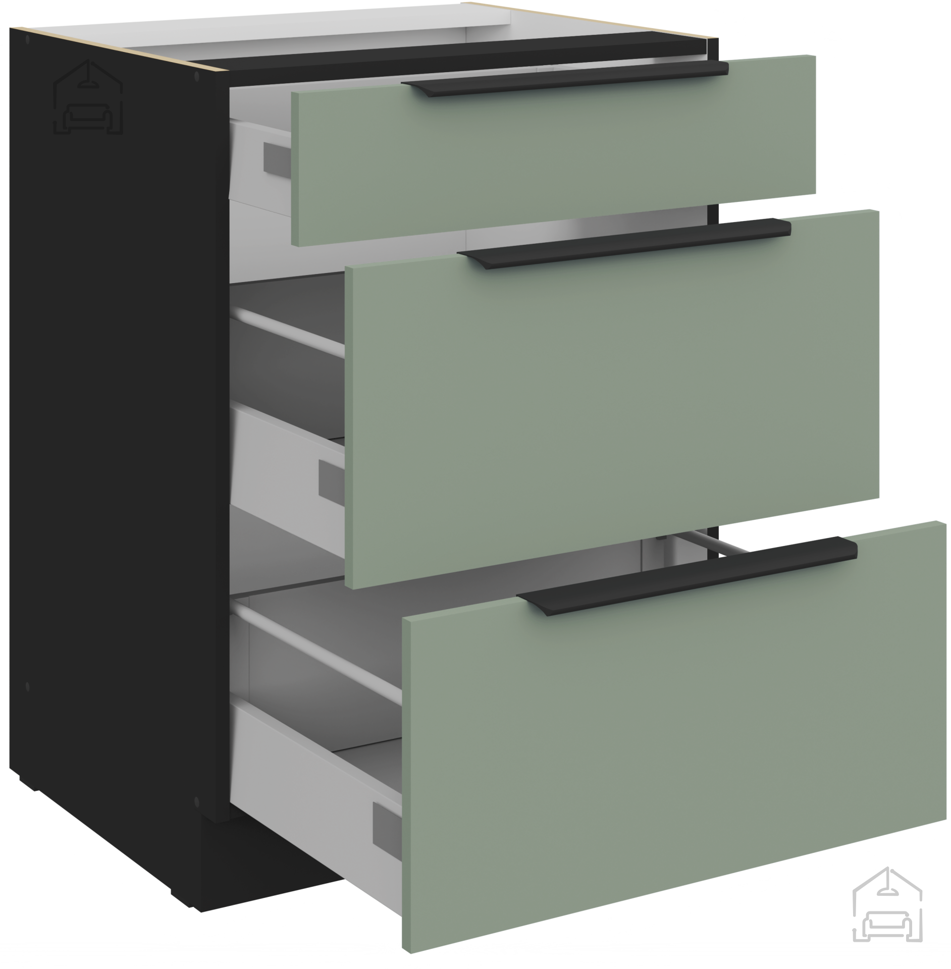 Die Arbeitsplatte mit der Bezeichnung 38‑6499 Marmor Roma sorgt für einen eleganten Abschluss des Ganzen. Das Marmormuster harmoniert schön mit den farbigen Fronten und verleiht einen Hauch von Prestige. Die Oberfläche ist feuchtigkeitsbeständig und leicht zu reinigen, was eine unbeschwerte Zubereitung von Speisen ermöglicht. Die Küchenelemente sind mit ästhetisch und praktisch gestalteten Griffen Edge UA‑HEXA aus schwarzer Aluminiumlegierung ausgestattet. Die Griffe sind in verschiedenen Abständen erhältlich – von 64 mm bis 320 mm – wodurch sie sich an unterschiedliche Tür- und Schubladengrößen anpassen lassen.