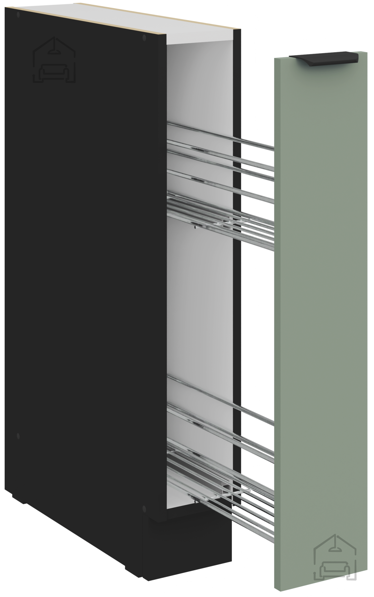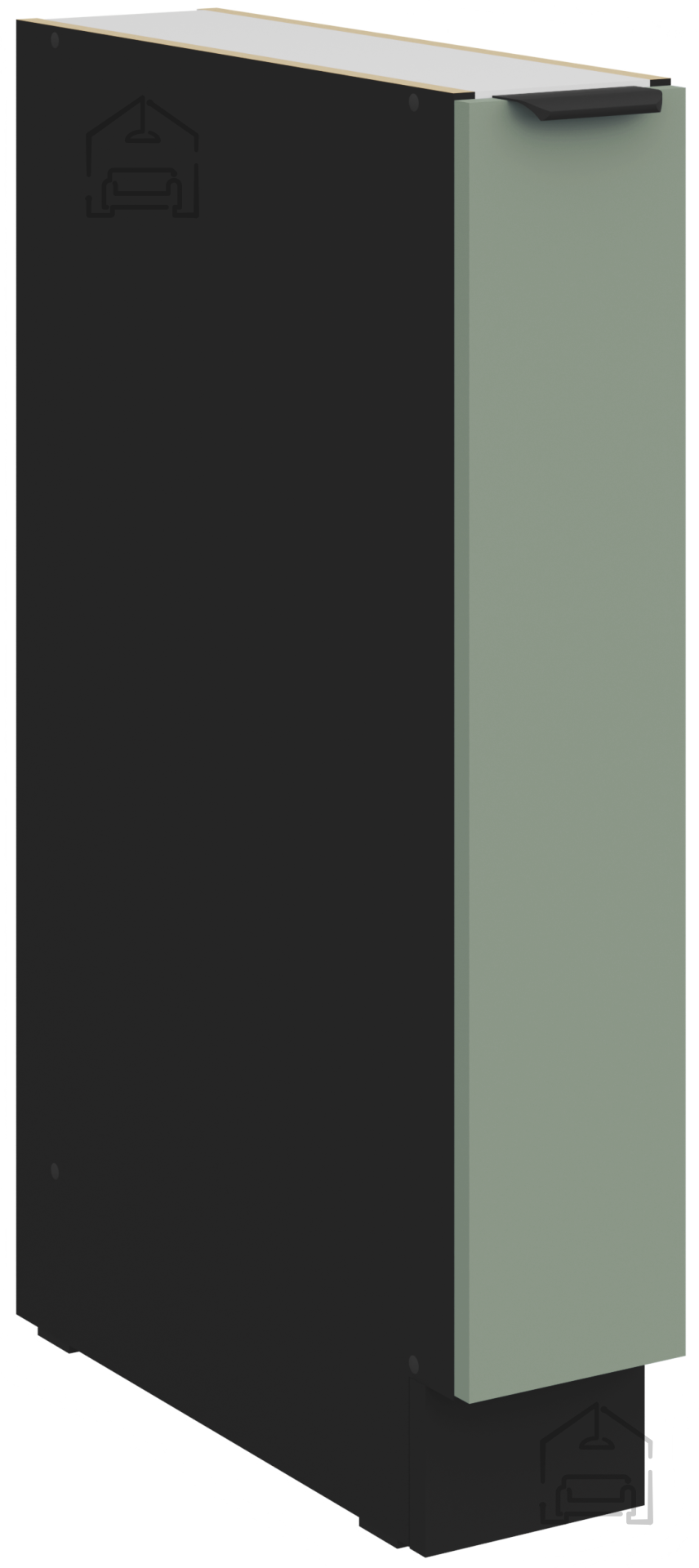 Die Arbeitsplatte mit der Bezeichnung 38‑6499 Marmor Roma sorgt für einen eleganten Abschluss des Ganzen. Das Marmormuster harmoniert schön mit den farbigen Fronten und verleiht einen Hauch von Prestige. Die Oberfläche ist feuchtigkeitsbeständig und leicht zu reinigen, was eine unbeschwerte Lebensmittelzubereitung ermöglicht. Die Küchenelemente sind mit ästhetisch und praktisch gestalteten Griffen Edge UA‑HEXA aus schwarz‑aluminiumhaltiger Legierung ausgestattet. Die Griffe sind in verschiedenen Abständen erhältlich – von 64 mm bis 320 mm – was eine Anpassung an verschiedene Tür‑ und Schubladengrößen ermöglicht.