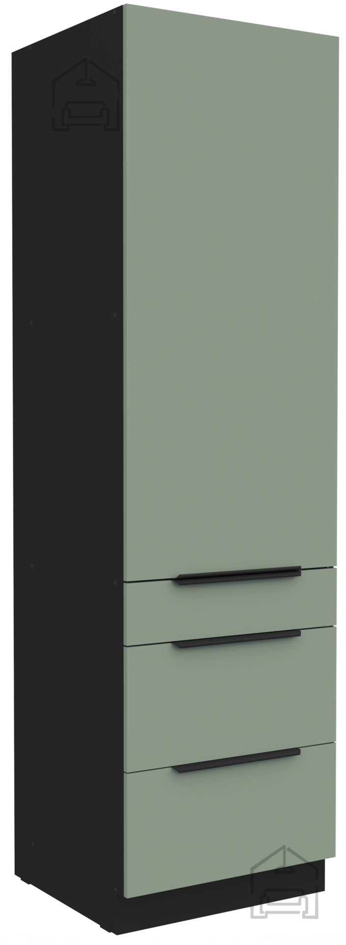 Die Arbeitsplatte mit der Bezeichnung 38‑6499 Marmor Roma sorgt für einen eleganten Abschluss des Ganzen. Das Marmormuster harmoniert schön mit den farbigen Fronten und verleiht einen Hauch von Prestige. Die Oberfläche ist feuchtigkeitsbeständig und leicht zu reinigen, was eine unbeschwerte Zubereitung von Speisen ermöglicht. Die Küchenelemente sind mit ästhetisch und praktisch gestalteten Griffen Edge UA‑HEXA aus schwarz‑aluminiumhaltiger Legierung ausgestattet. Die Griffe sind in verschiedenen Abständen erhältlich – von 64 mm bis 320 mm – was eine Anpassung an unterschiedliche Tür- und Schubladengrößen ermöglicht.