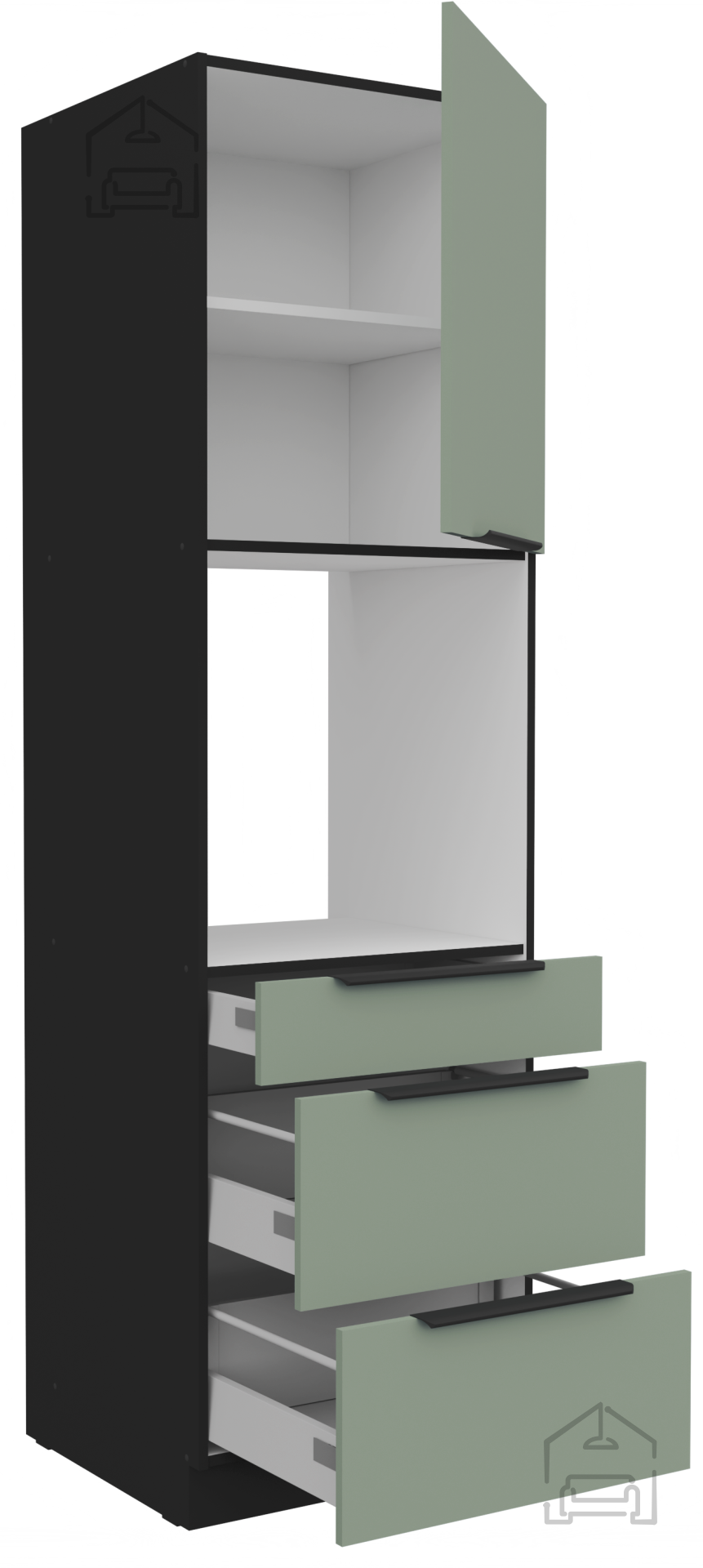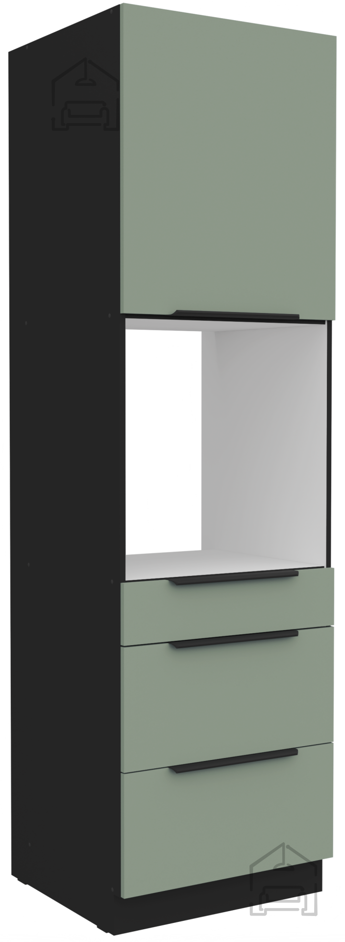 Die Arbeitsplatte mit der Bezeichnung 38‑6499 Marmor Roma sorgt für einen eleganten Abschluss des Ganzen. Das Marmormuster harmoniert schön mit den farbigen Fronten und verleiht einen Hauch von Prestige. Die Oberfläche ist feuchtigkeitsbeständig und leicht zu reinigen, was eine unbeschwerte Zubereitung der Speisen ermöglicht. Die Küchenelemente sind mit ästhetisch und praktisch gestalteten Griffen Edge UA‑HEXA aus schwarzer Aluminiumlegierung ausgestattet. Die Griffe sind in verschiedenen Abständen erhältlich – von 64 mm bis 320 mm – was eine Anpassung an verschiedene Tür‑ und Schubladengrößen ermöglicht.
