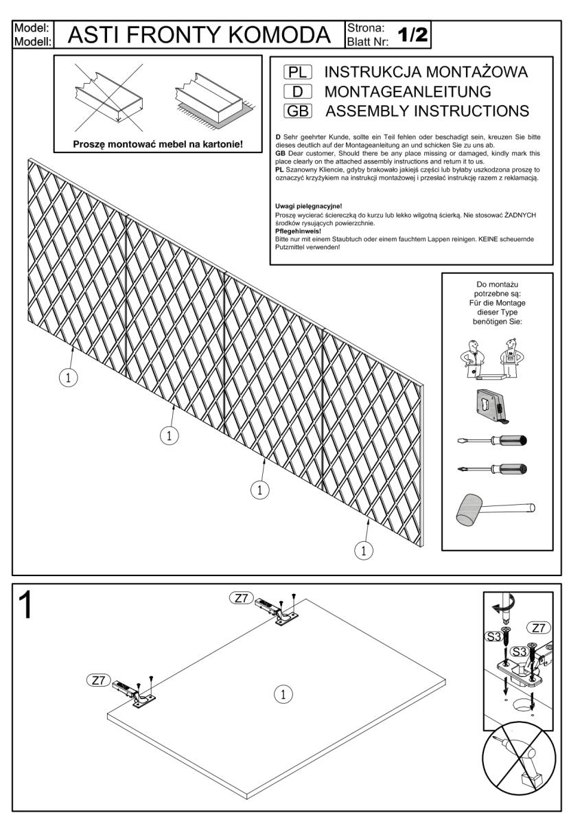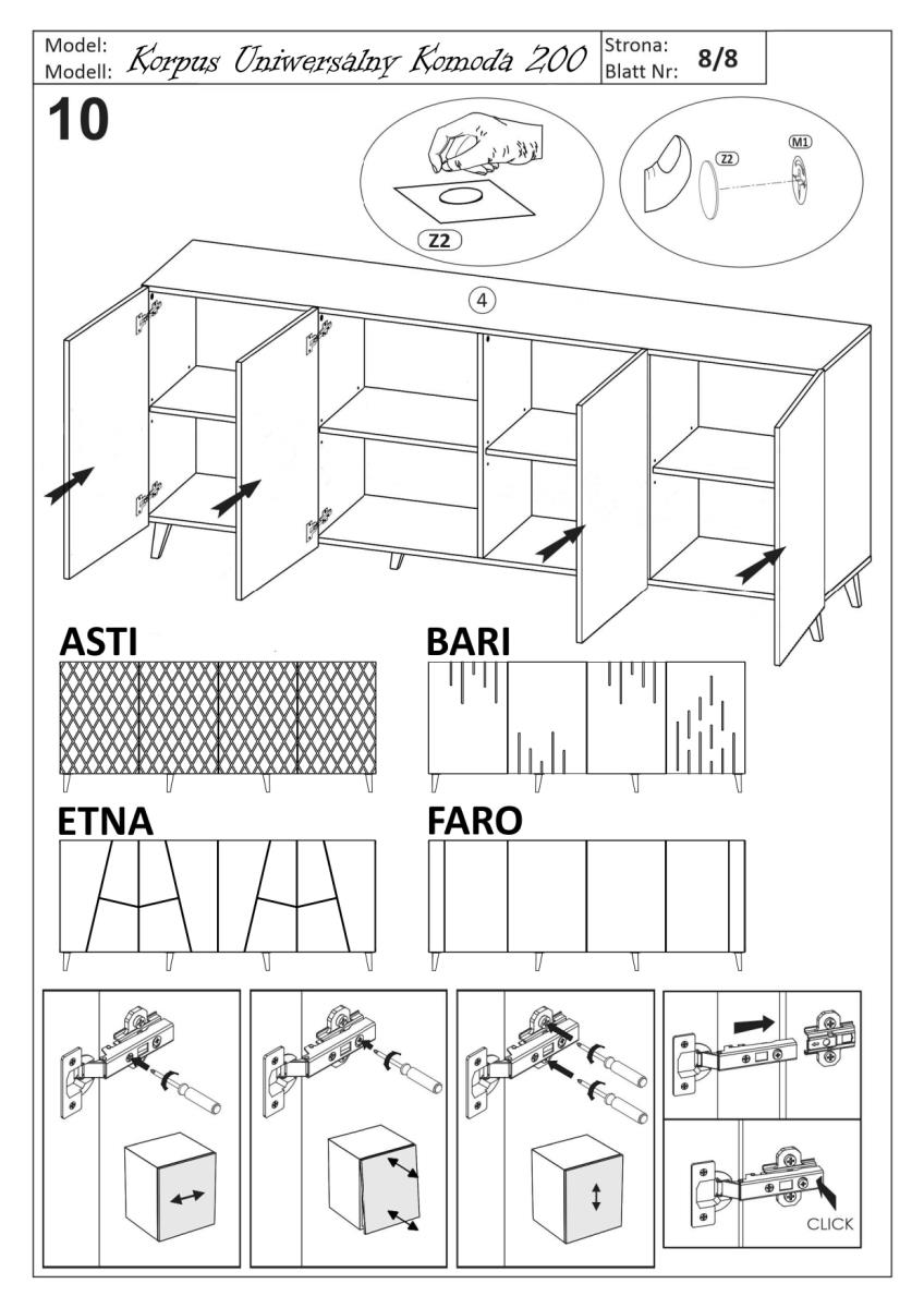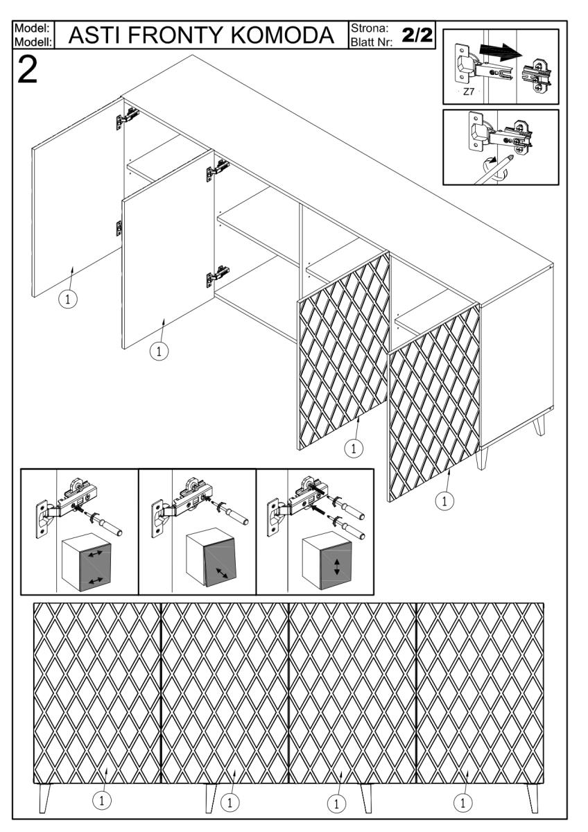 Die Kommode Asti ist ohne klassische Griffe gestaltet. Die Fronten ragen etwas über die obere Platte hinaus, was das einfache Öffnen der Türen und Schubladen durch Berührung ermöglicht. Eine solche Lösung betont die klaren Linien und den modernen Charakter des Möbels. Beine aus schwarzem Kunststoff sorgen für Stabilität und heben die Konstruktion leicht vom Boden ab, was die Reinigung der unteren Oberfläche erleichtert und gleichzeitig die untere Kante vor mechanischen Beschädigungen schützt.