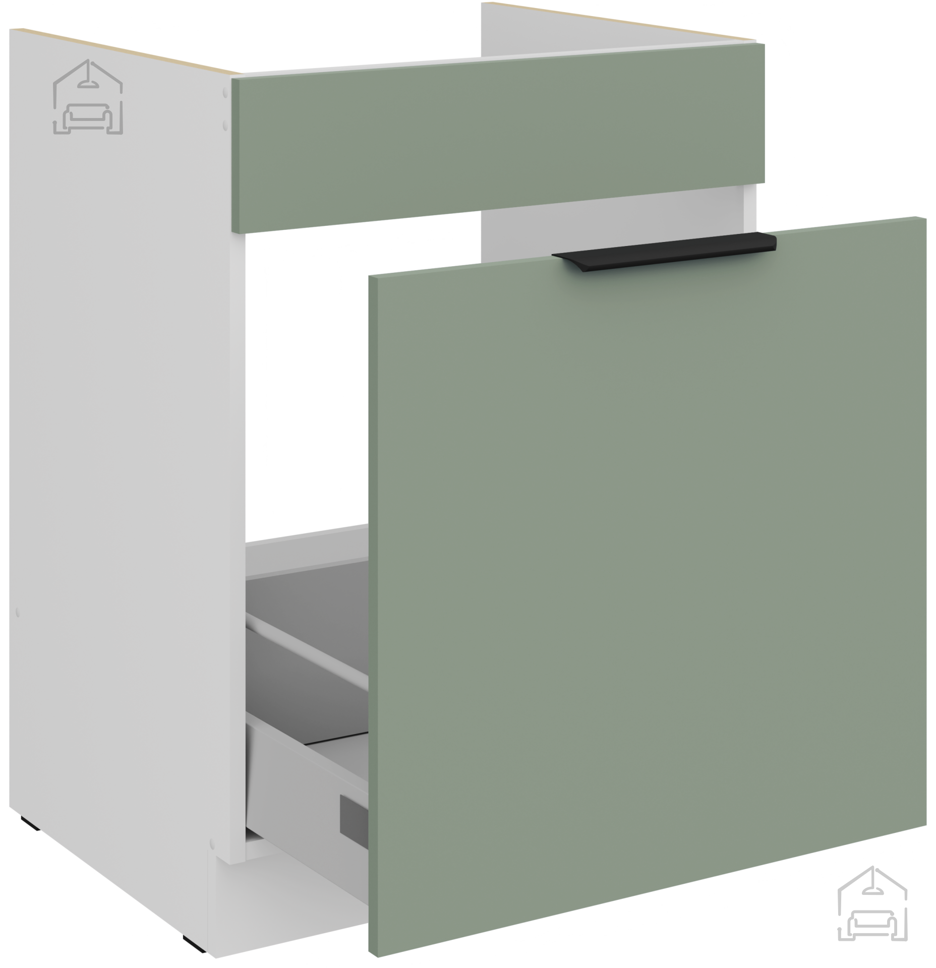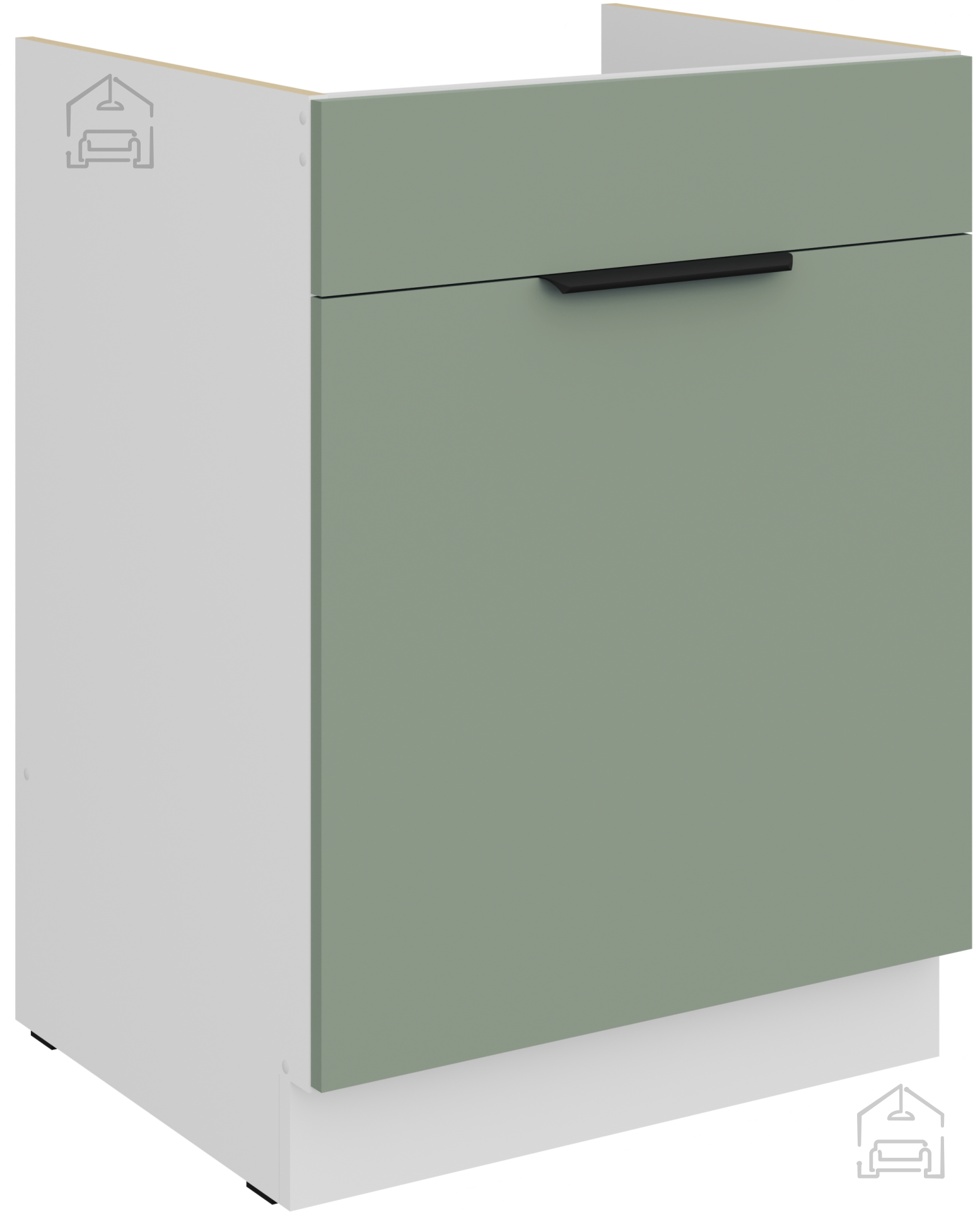 Die Basis des Küchenensembles ist ein Spanplattenrahmen, der strukturelle Stabilität und Widerstandsfähigkeit gegen tägliche Belastungen gewährleistet. Die Oberfläche aus 16 mm laminierten Platten ist kratz-, flecken- und hitzebeständig, was sie ideal für den intensiven Kücheneinsatz macht. Alle Fronten und Schubladen sind mit einem Soft-Close-System ausgestattet, das plötzliche Schläge verhindert und ein sanftes Schließen der Türen ermöglicht. Dieser Mechanismus trägt nicht nur zum Komfort bei, sondern verlängert auch die Lebensdauer der Beschläge.
