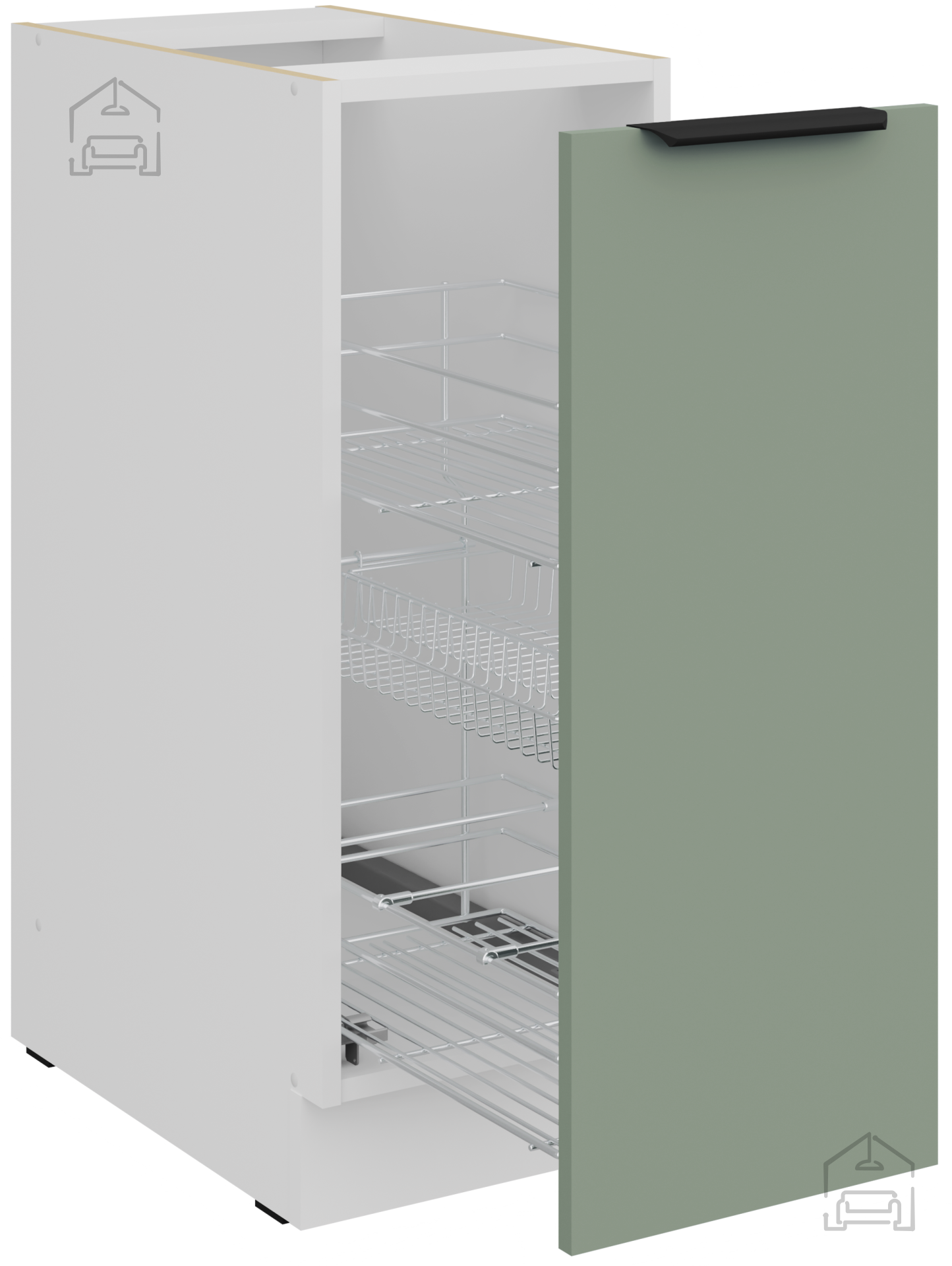 Die Basis des Küchenensembles ist ein Rahmen aus Spanplatte, der strukturelle Stabilität und Widerstandsfähigkeit gegen tägliche Belastungen gewährleistet. Die Oberfläche aus 16 mm laminierten Platten ist kratz-, flecken- und hitzebeständig, was sie für den intensiven Küchengebrauch geeignet macht. Alle Fronten und Schubladen sind mit einem Soft-Close-System ausgestattet, das plötzliche Schläge verhindert und ein sanftes Schließen der Türen ermöglicht. Dieser Mechanismus trägt nicht nur zum Komfort bei, sondern auch zur längeren Lebensdauer der Beschläge.