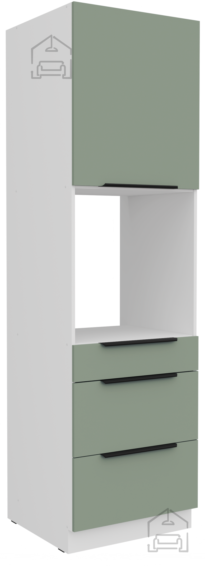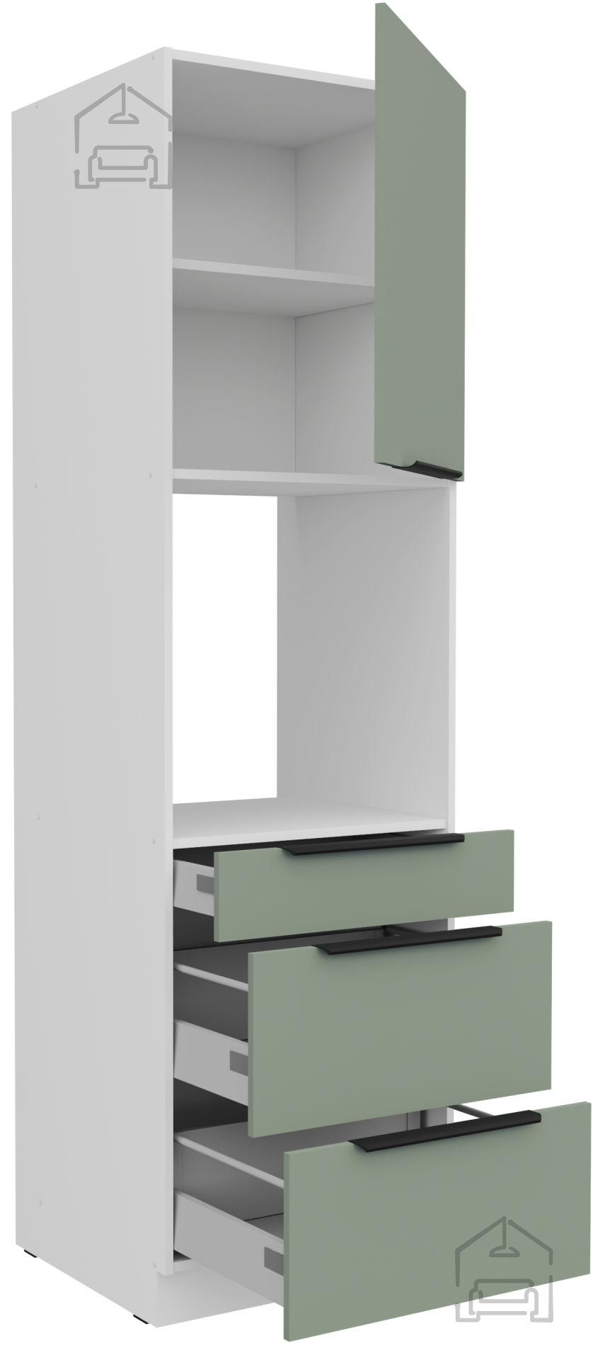 Die Basis des Küchenensembles ist ein Rahmen aus Spanplatte, der strukturelle Stabilität und Widerstandsfähigkeit gegen tägliche Belastungen gewährleistet. Die Oberfläche aus 16 mm laminierten Platten ist kratz-, flecken- und hitzebeständig, was sie für den intensiven Küchengebrauch geeignet macht. Alle Fronten und Schubladen sind mit einem Soft-Close-System ausgestattet, das plötzliche Stöße verhindert und ein sanftes Schließen der Türen ermöglicht. Dieser Mechanismus trägt nicht nur zum Komfort bei, sondern auch zur längeren Lebensdauer der Beschläge.