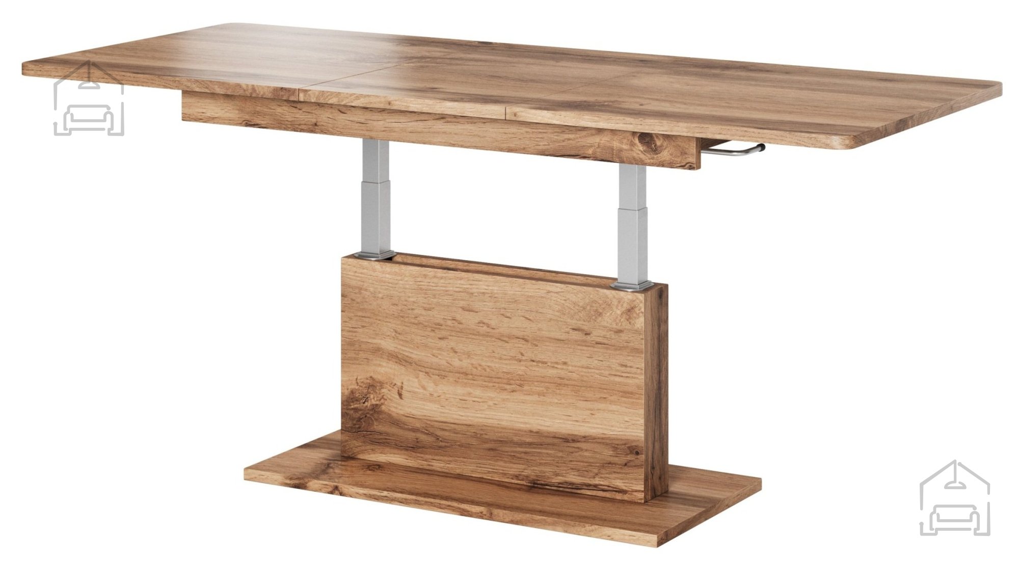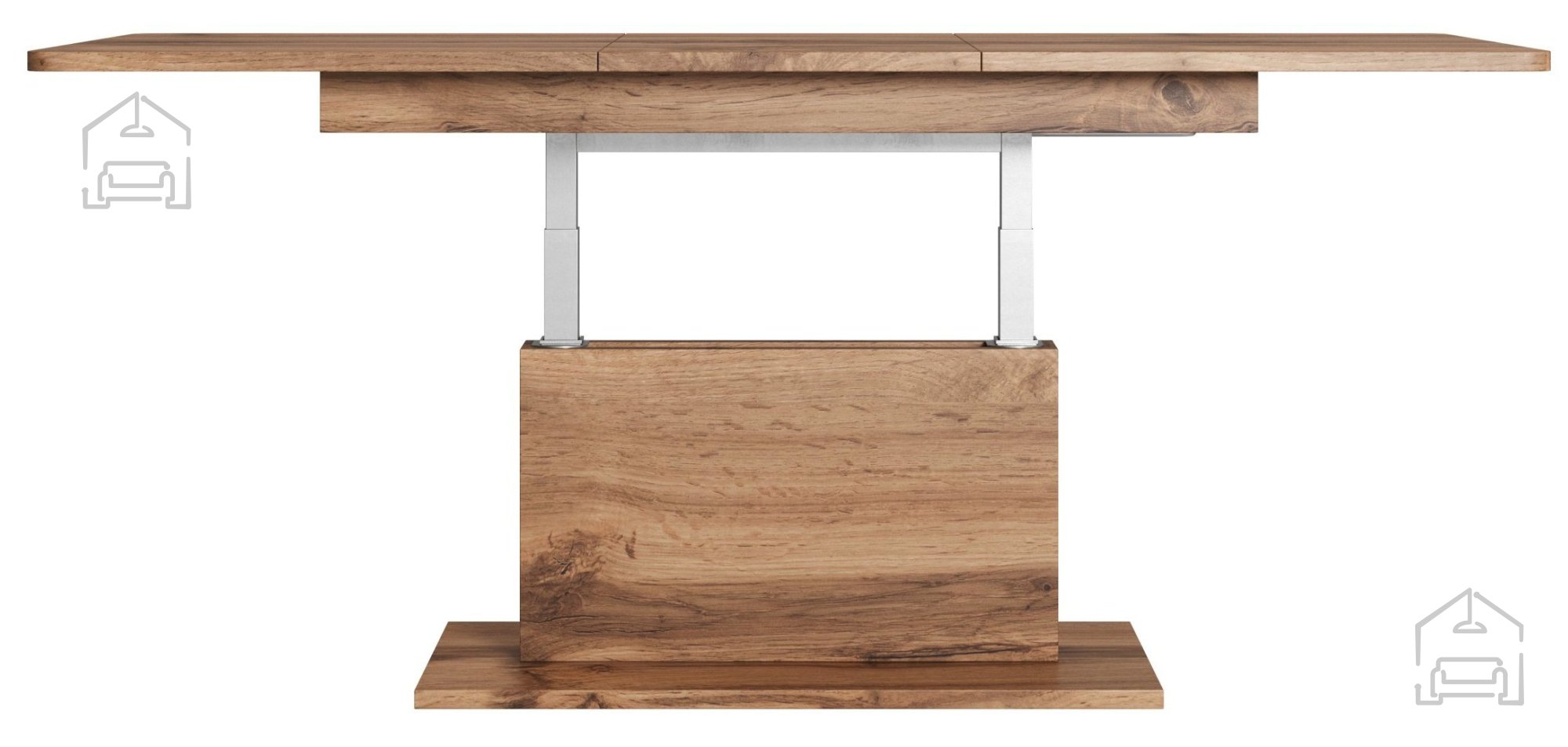 Der Tisch lässt sich von einer Grundlänge von 126 cm auf bis zu 167 cm ausziehen und verwandelt sich so im Handumdrehen von einem kleineren Couchtisch in eine großzügigere Fläche – ideal zum gemeinsamen Essen oder Arbeiten. Die Breite beträgt 70 cm, die Höhe ist zwischen 56 und 74 cm verstellbar. Diese Bandbreite ermöglicht eine einfache Anpassung an unterschiedliche Aktivitäten: niedrig für entspanntes Sitzen am Sofa, höher für den Ess- oder Arbeitsbereich. Diese Vielseitigkeit macht ihn perfekt für kleinere Wohnungen oder Räume, in denen Platz optimal genutzt werden soll.
