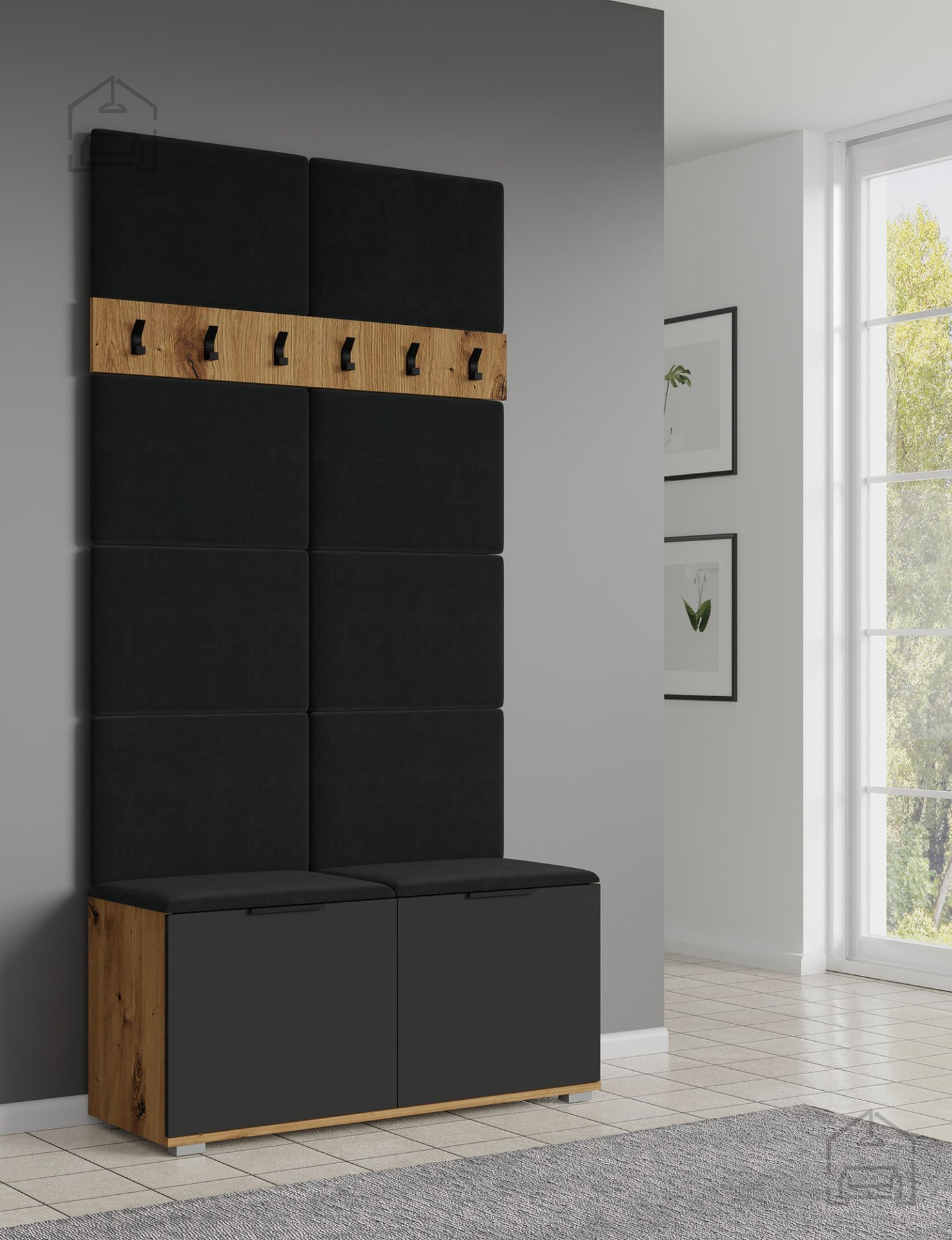 Die schwarze Farbe des Paneels betont seine minimalistische Eleganz und ermöglicht zahlreiche Kombinationsmöglichkeiten mit anderen Farben und Texturen. Es eignet sich für Innenräume, in denen moderne, industrielle oder klassische Töne vorherrschen. Aufgrund seines neutralen Aussehens passt es hervorragend zu hellen Wänden, Holzoberflächen oder metallischen Accessoires. Der schwarze Stoff BLUVEL #19 verleiht dem Paneel Tiefe und ein Gefühl von Luxus, ist aber gleichzeitig dezent genug, um andere Elemente des Interieurs nicht zu überlagern.