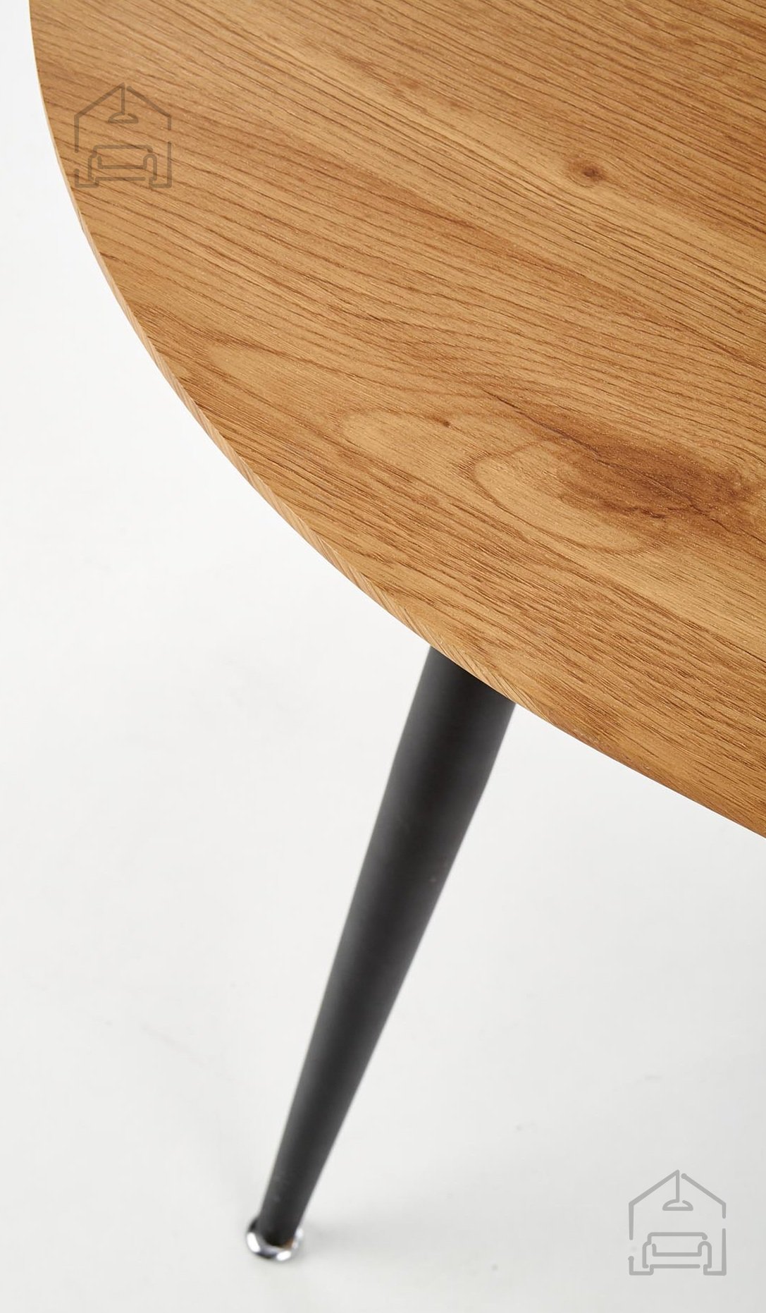 Die Tischplatte besteht aus hochwertiger MDF-Platte, mit einem Furnier in der Farbe Golden Oak versehen, das dem Tisch eine natürliche Holzoptik verleiht und zugleich pflegeleicht sowie widerstandsfähig gegen alltägliche Abnutzung macht. Die Oberfläche ist glatt und kratzfest, wodurch der Tisch auch nach längerem Gebrauch seine ästhetische Wirkung behält. Die Beine sind aus schwarz pulverbeschichtetem Stahl gefertigt, was der Konstruktion Stabilität und Langlebigkeit verleiht. Die Pulverbeschichtung schützt zusätzlich vor Korrosion und mechanischen Beschädigungen, sodass der Tisch auch nach Jahren noch wie neu aussieht.