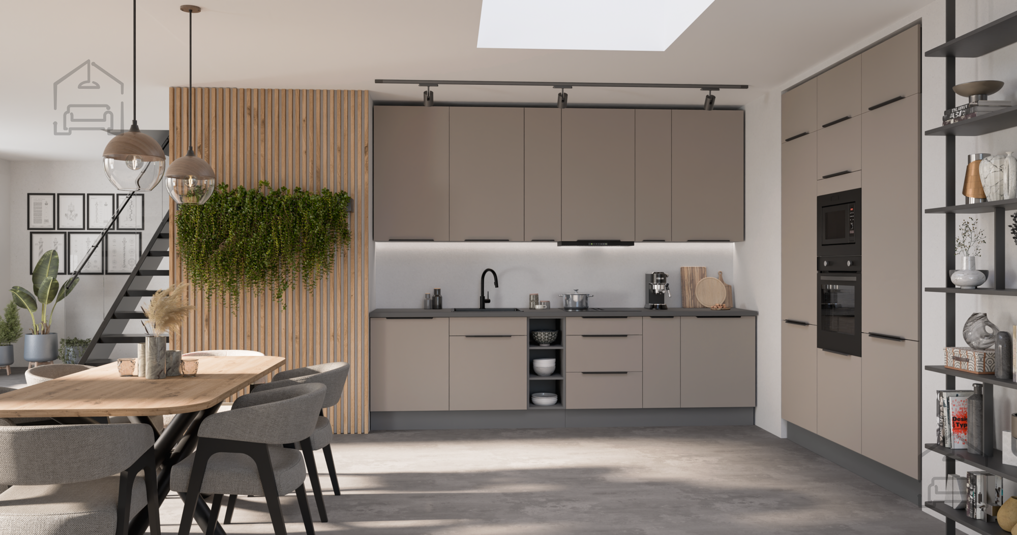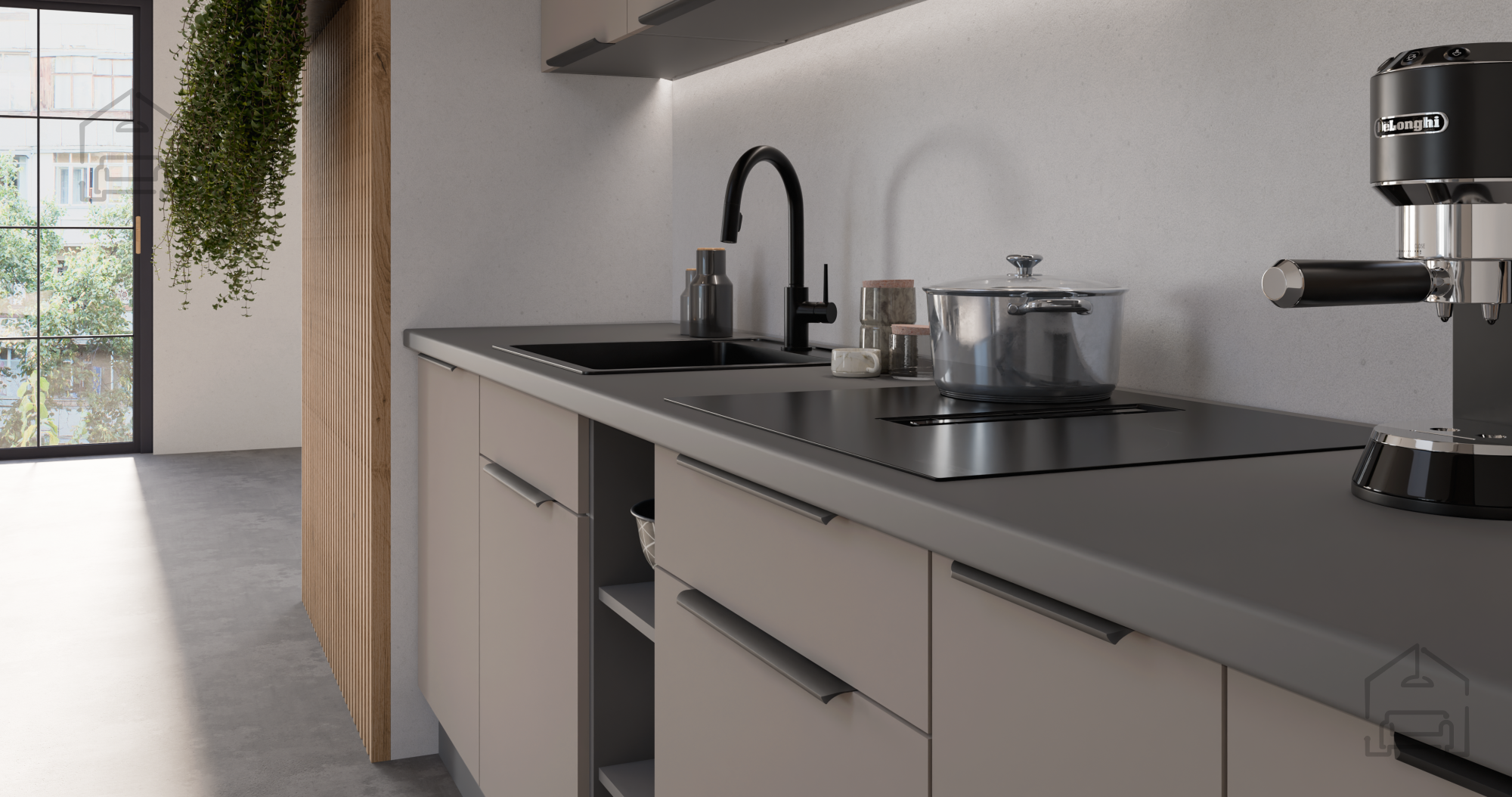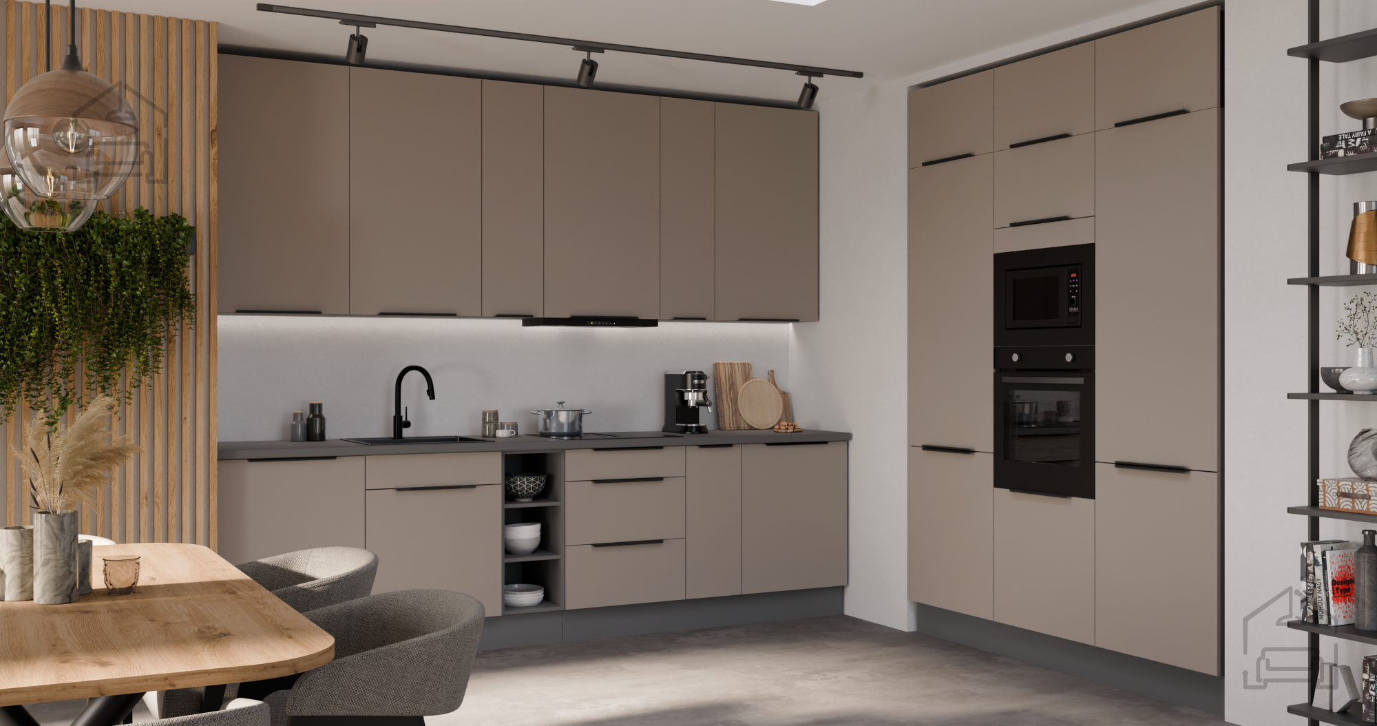 Die Küchenzeile Aria ist für alle gedacht, die ein Gleichgewicht zwischen modernem Aussehen, hochwertiger Verarbeitung und Funktionalität suchen. Die Farbkombination Sandgrau/Anthrazit schafft einen harmonischen Raum, der sich leicht mit anderen Materialien wie Metall, Glas oder Holz kombinieren lässt. Dank der einfachen Pflege, der langlebigen Materialien und der durchdachten Details behält diese Küchenzeile lange ihr ursprüngliches Erscheinungsbild und bietet ein komfortables Benutzererlebnis.
