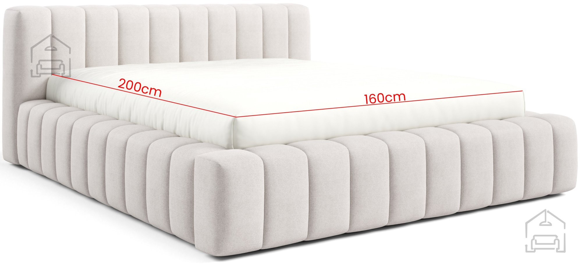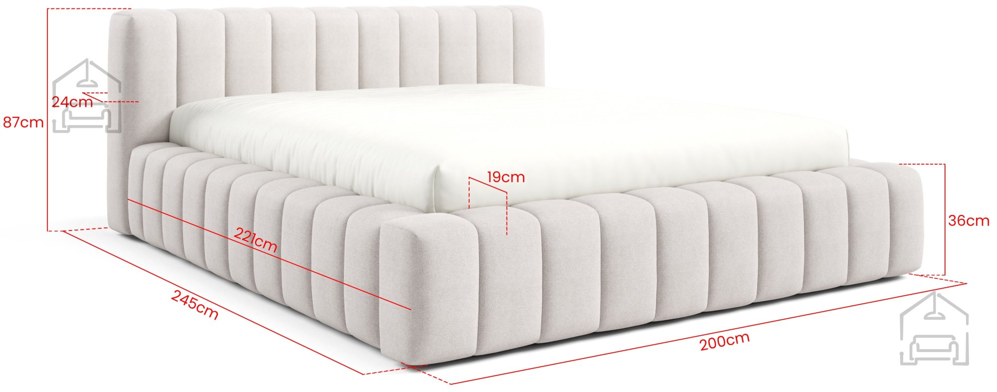 Die Gesamtmaße des Bettes betragen 245x87 cm, wobei die Höhe des Kopfteils 87 cm, die Höhe der Seitenwand 36 cm, die Dicke der Seitenwand 19 cm, die Dicke des Kopfteils 24 cm und die Höhe der Füße 1 cm (Gleiter) beträgt. Es ist in verschiedenen Breiten der Liegefläche erhältlich: 160 bei einer Länge von 200 cm. Der Benutzer kann zwischen verschiedenen Farbkombinationen und Stoffarten wählen, was eine perfekte Anpassung an den Einrichtungsstil des Schlafzimmers ermöglicht.