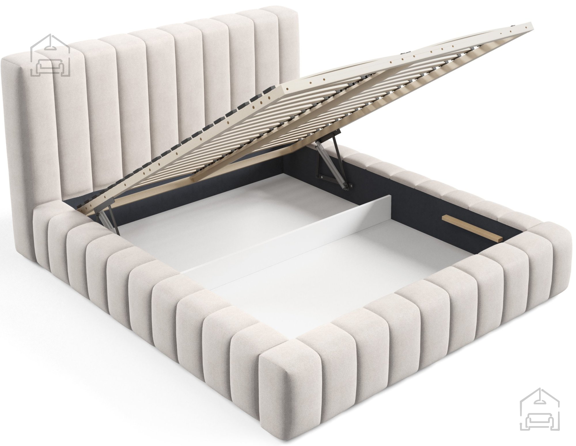 Das Modell Gino ist mit einem Hebemechanismus und einem Lattenrost ausgestattet, der eine luftige Unterstützung der Matratze und ein einfaches Anheben der Liegefläche ermöglicht. Der eingebaute Bettkasten ist geräumig und diskret, unter der Liegefläche verborgen. Diese Lösung verbindet modernes Design mit Funktionalität, da sie zusätzlichen Stauraum bietet, ohne dass zusätzliche Schränke oder Schubladen erforderlich sind.
