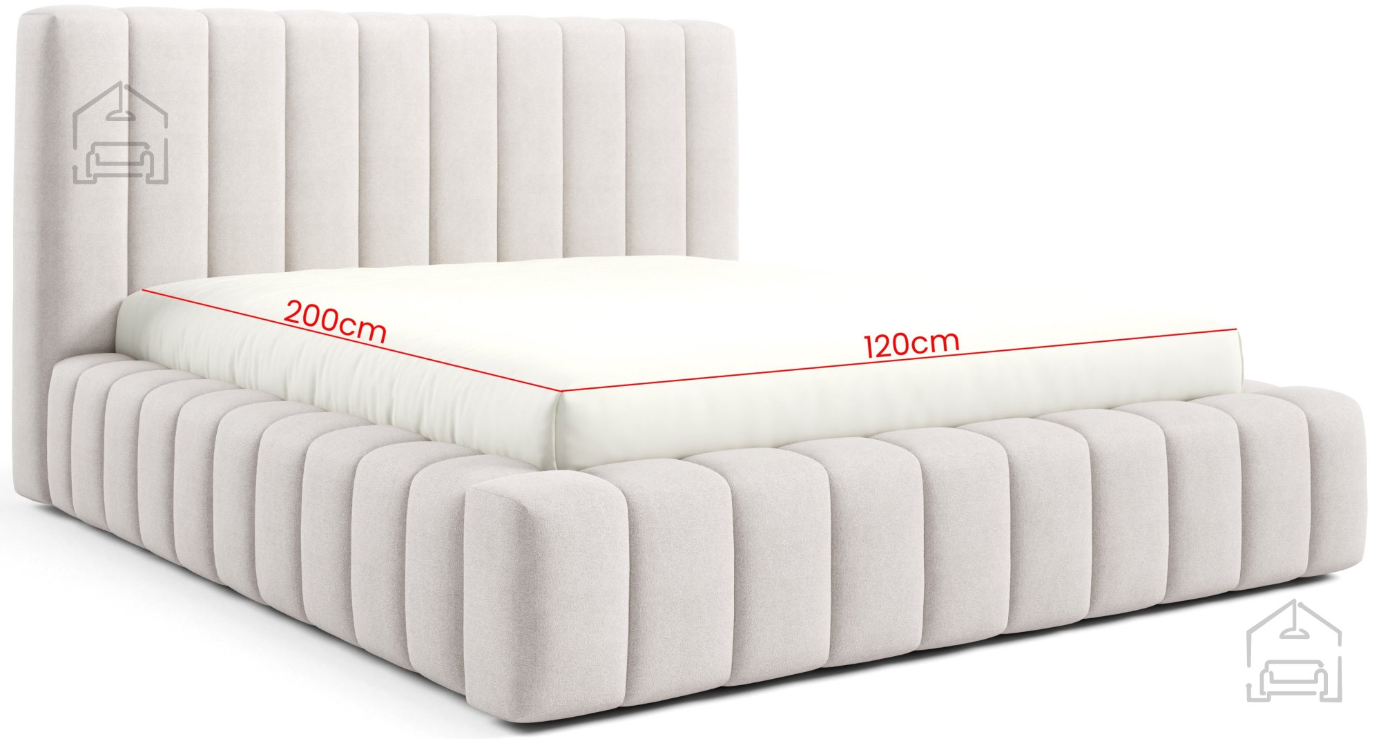 Die Gesamtmaße des Bettes betragen 245x127 cm, wobei die Höhe des Kopfteils 127 cm, die Höhe der Seitenblende 36 cm, die Dicke der Seitenblende 19 cm, die Dicke des Kopfteils 24 cm und die Höhe der Füße 1 cm (Gleiter) beträgt. Es ist in verschiedenen Breiten der Liegefläche erhältlich: 120 bei einer Länge von 200 cm. Der Benutzer kann zwischen verschiedenen Farbkombinationen und Stoffarten wählen, was eine vollständige Anpassung an den Einrichtungsstil des Schlafzimmers ermöglicht.