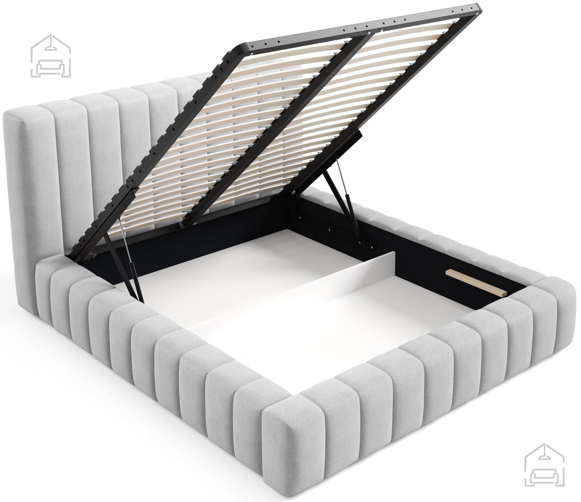 Das Modell Gino ist mit einem Hebemechanismus und einem Lattenrost ausgestattet, der eine luftdurchlässige Unterstützung der Matratze und ein einfaches Anheben der Liegefläche ermöglicht. Die eingebaute Bettzeugschublade ist geräumig und diskret unter der Liegefläche versteckt. Diese Lösung kombiniert modernes Design mit Funktionalität, da sie zusätzlichen Stauraum bietet, ohne dass zusätzliche Schränke oder Schubladen erforderlich sind.