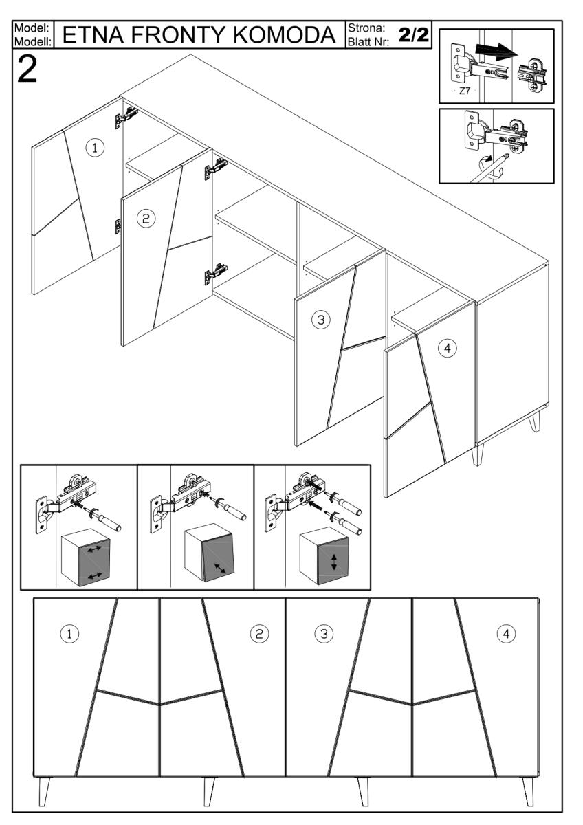 Die Kommode Etna zeichnet sich durch ihre grifflose Öffnung aus, bei der die Frontplatten leicht über die obere Platte hinausragen und so einen bequemen Griff ermöglichen. Dieses Detail bewahrt die glatten Linien und das minimalistische Erscheinungsbild, das sich gut in moderne Interieurs einfügt. Die weiße matte Farbe betont zusätzlich die Schlichtheit der Form und ermöglicht eine einfache Kombination mit Möbeln und Accessoires in verschiedenen Farben oder Texturen. Kunststofffüße sorgen für Stabilität und schützen gleichzeitig den Boden vor Kratzern.