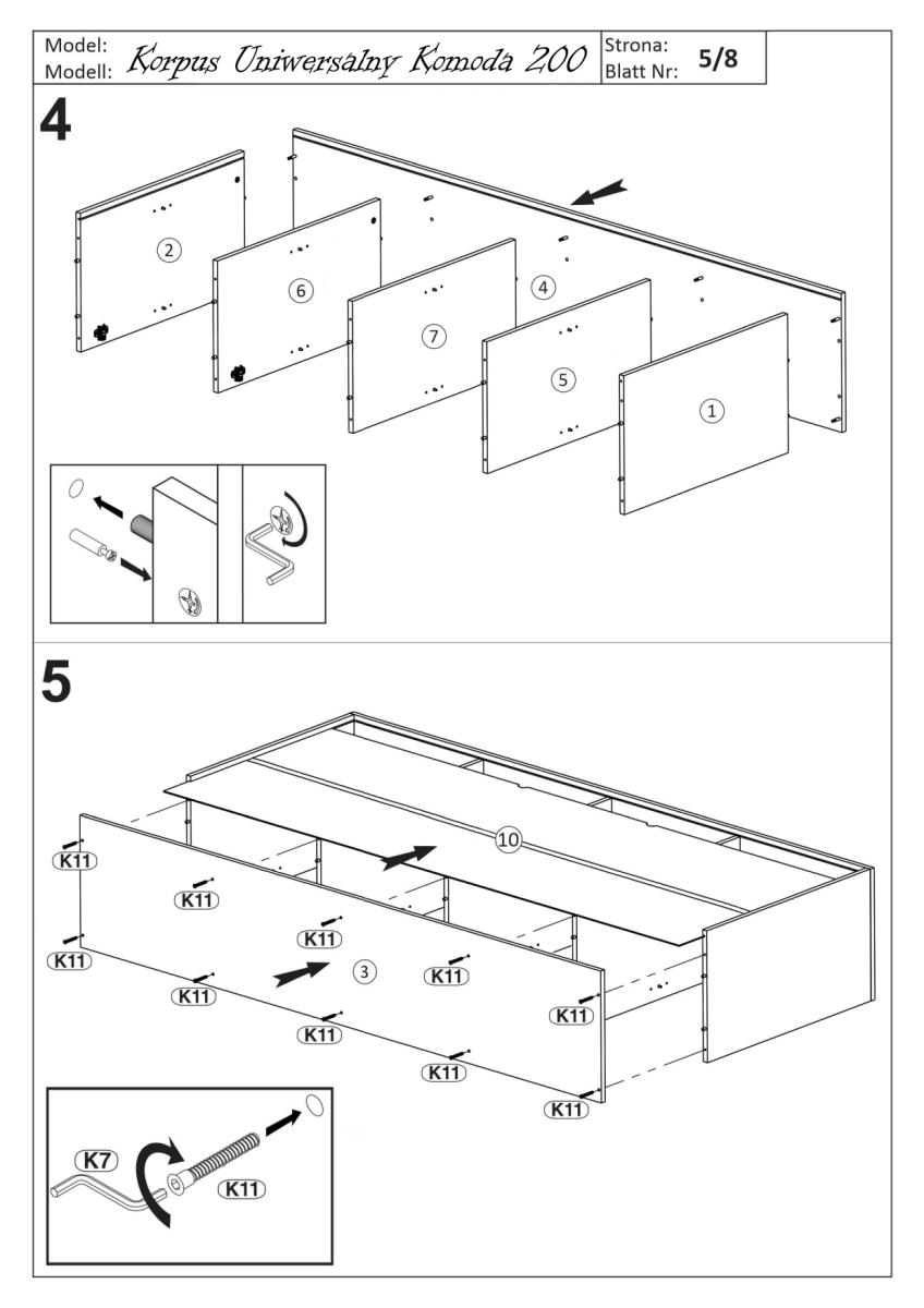 Der Korpus der Kommode besteht aus einer matten laminierten Platte mit einer Stärke von 16 mm, was Stabilität und eine lange Lebensdauer gewährleistet. Die Frontplatten bestehen aus MDF-Platten, die mit einer PVC-Folie gleicher Stärke laminiert sind, was ihnen eine glatte Oberfläche, Kratzfestigkeit und einfache Reinigung verleiht. Die Kombination dieser Materialien ermöglicht ein Gleichgewicht zwischen ästhetischem Erscheinungsbild und praktischer Nutzung. Die Oberflächen sind so gestaltet, dass sie den täglichen Gebrauch ohne sichtbare Gebrauchsspuren überstehen.