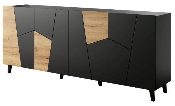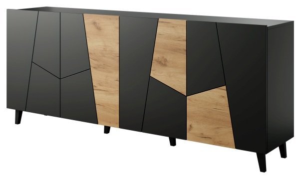 Die schwarze Farbe des Korpus in Kombination mit der Eiche-Craft-Dekoration schafft einen harmonischen Kontrast, der Wärme und Eleganz ausstrahlt. Eine solche Farbabstimmung lässt sich leicht mit verschiedenen Einrichtungsstilen kombinieren – von industriell über skandinavisch bis hin zu modern-minimalistisch. Die matte Oberfläche reflektiert kein Licht, wodurch die Kommode auch in hellen Räumen ruhig und anspruchsvoll wirkt.