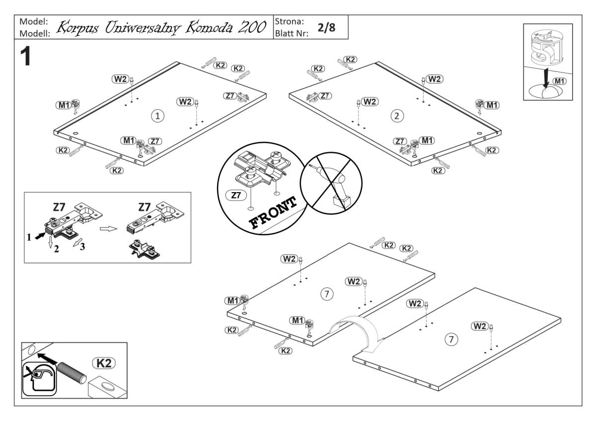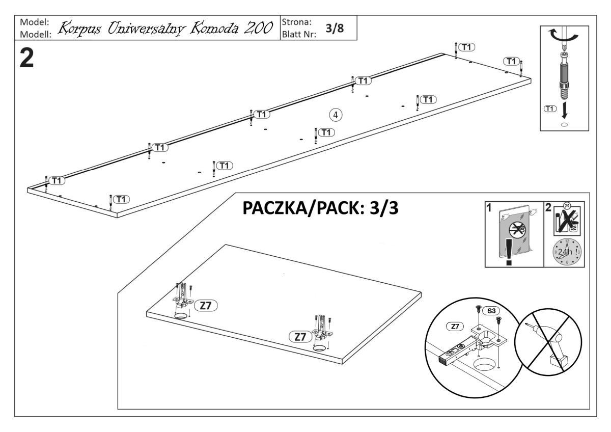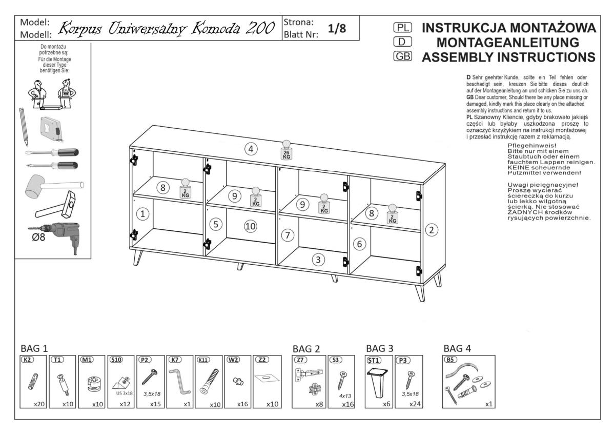 Die Kommode steht auf diskreten Kunststofffüßen, die Stabilität gewährleisten und den Boden vor Kratzern schützen. Ihr niedriges Design beeinträchtigt nicht das Gesamtbild, sondern betont den schwebenden Effekt des Korpus. Dank der einfachen Linien und ergonomischen Lösungen ist die Pflege der Kommode unkompliziert – die Oberflächen lassen sich leicht mit einem weichen, feuchten Tuch abwischen.