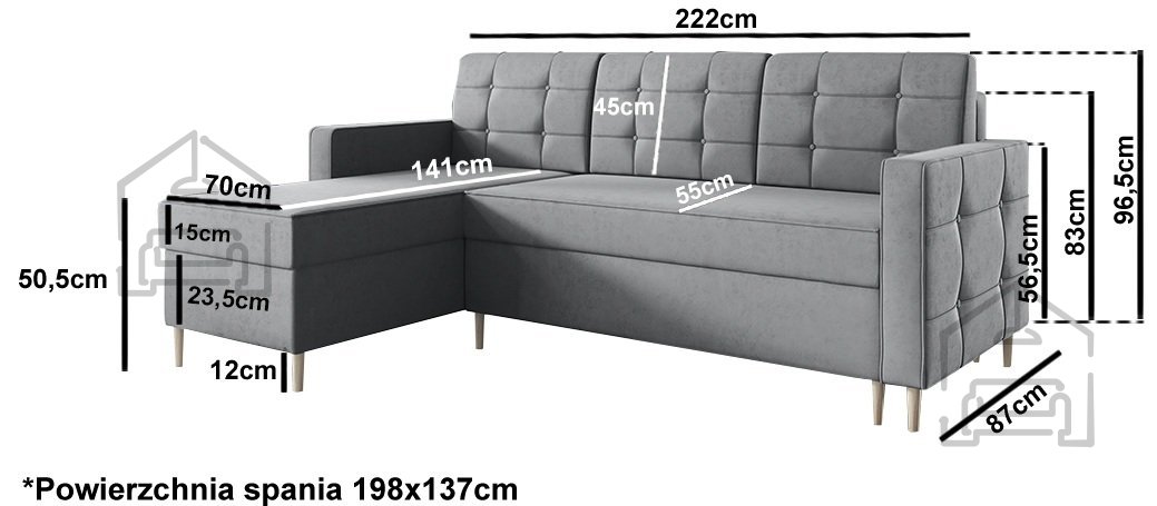 Die bei der Herstellung von Sofas und Sitzgarnituren verwendeten Materialien sind verschiedene Arten von Polyurethanschaum, Synthepon, Viscolatex usw. Es handelt sich um Produkte mit einem hohen Kompressions- und Elastizitätskoeffizienten, daher behält sich der Hersteller das Recht auf negative und positive Toleranzen von +/- 2% in Breite und Länge vor.