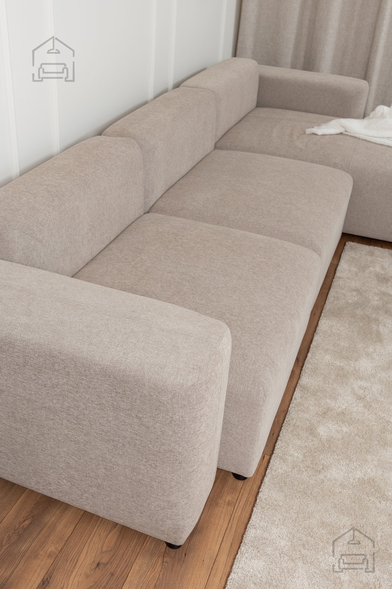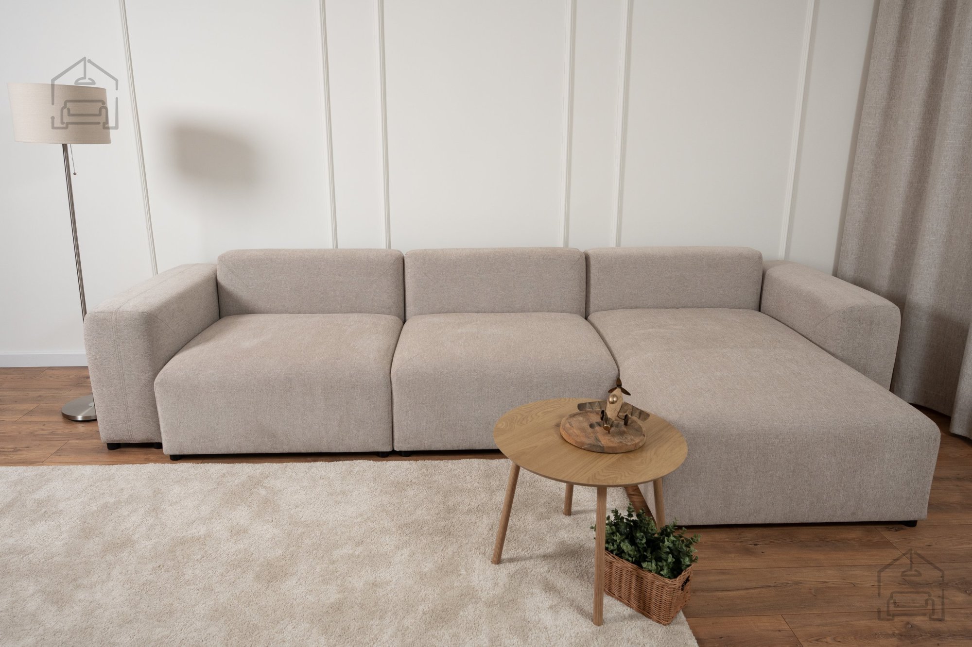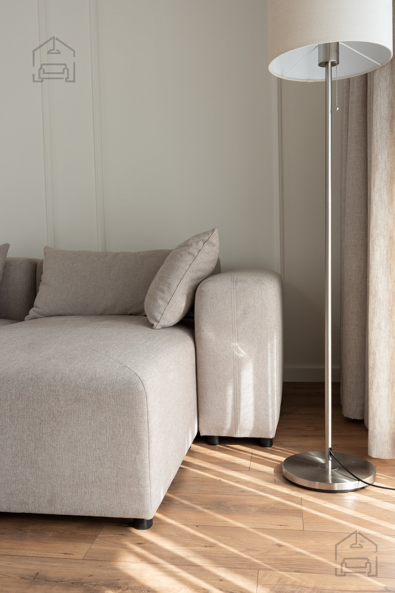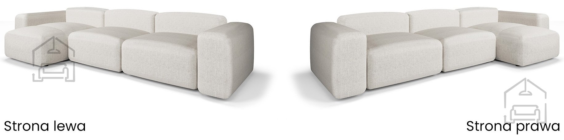 Das modulare Design ermöglicht es Ihnen, die Aufstellung zu wählen, die Ihrem Raum am besten entspricht – entweder die rechte oder die linke Variante. Das Sofa verfügt über keine Schlaffunktion und ist daher vollständig für bequemes Sitzen und Entspannen bestimmt. Im Inneren befindet sich jedoch eine Bettzeugschublade, die eine praktische Aufbewahrung von Decken, Kissen oder anderen Accessoires ermöglicht. Der Mechanismus zur Verbindung der Elemente basiert auf zuverlässigen Verbindungsstücken vom Typ „Krokodil“, was nach der Montage eine feste und stabile Konstruktion gewährleistet.