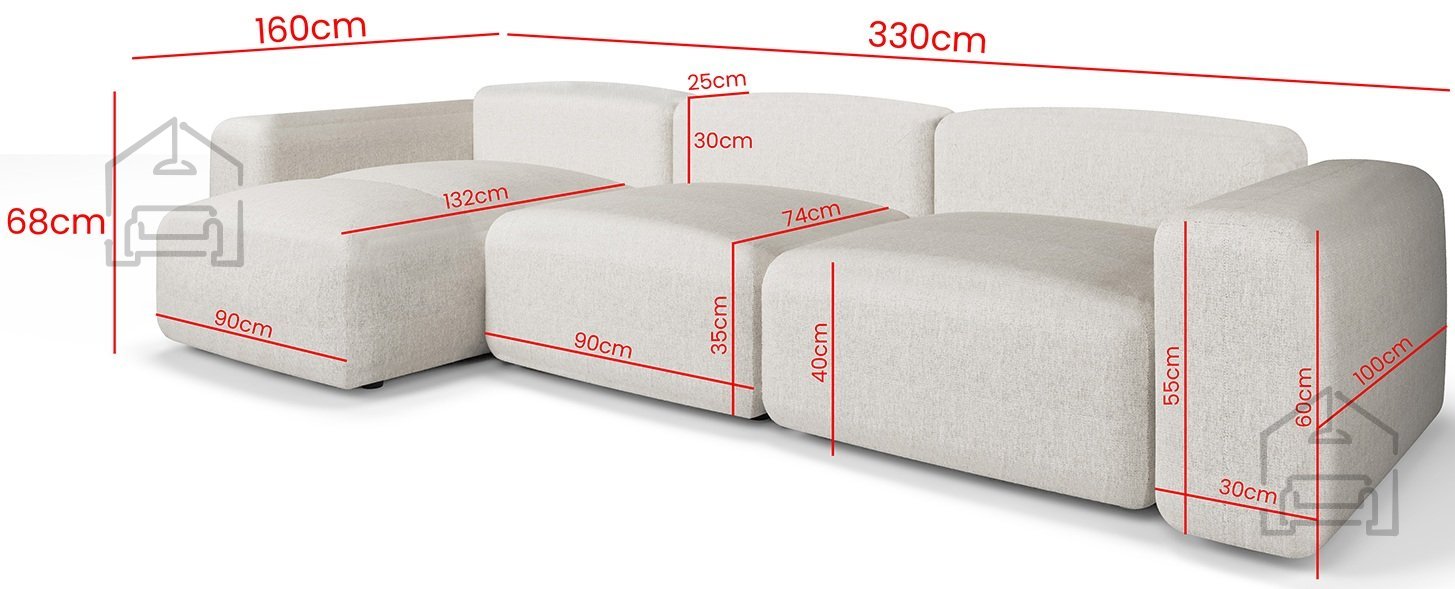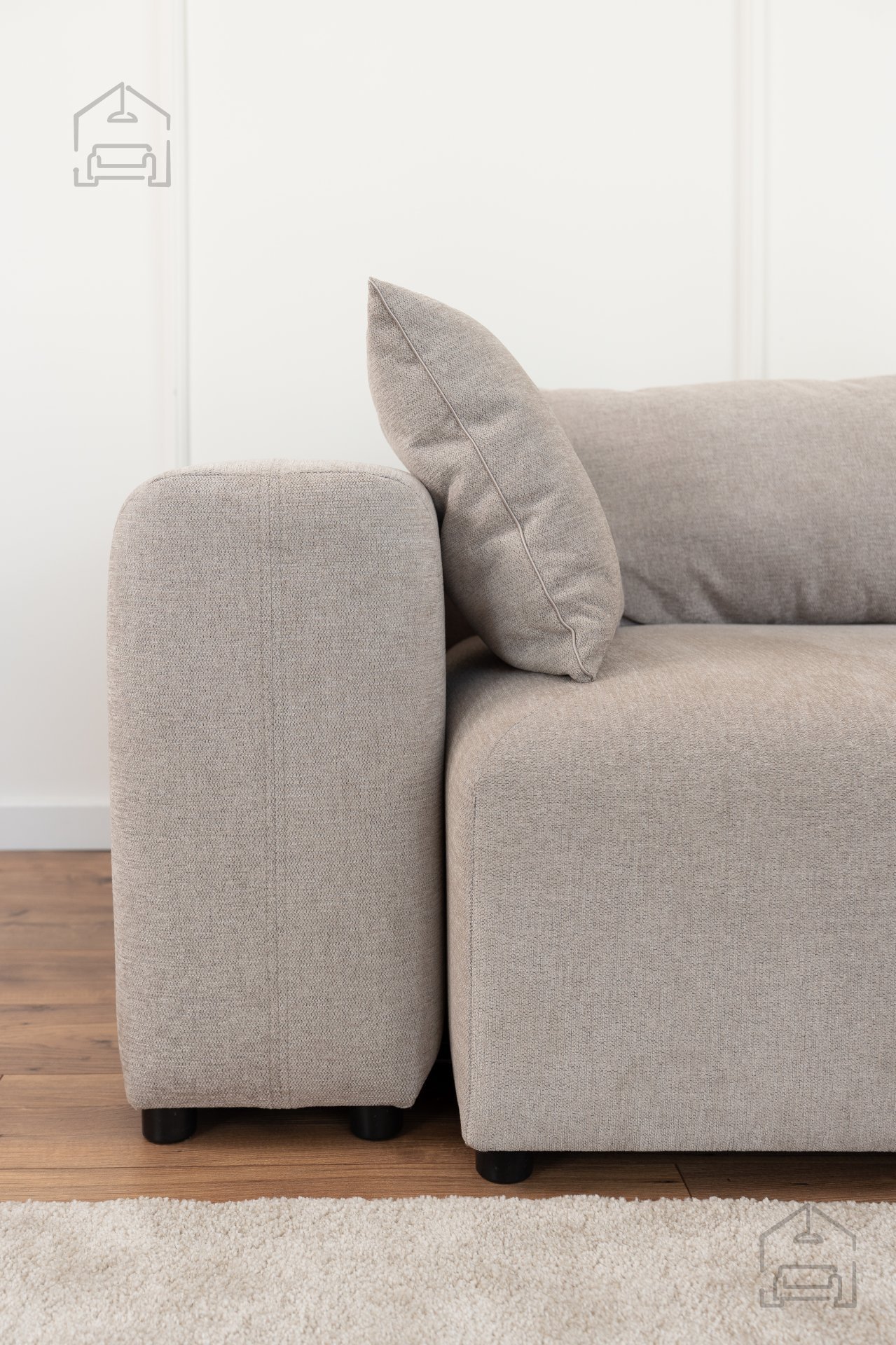 Das Ecksofa Modular mit Kissen ist die perfekte Wahl für jeden modernen Wohnraum, der Funktionalität, Komfort und ästhetische Vollkommenheit vereinen möchte. Mit den Maßen 330x160x68 cm bietet es ausreichend Platz für entspanntes Sitzen mehrerer Personen, und sein modulares Design ermöglicht eine einfache Anpassung der Aufstellung, da es in einer linken oder rechten L-Variante erhältlich ist. Es wird in der Fabrik PKMebel in Polen hergestellt, wo hochwertige Verarbeitung und modernes Design aufeinandertreffen.