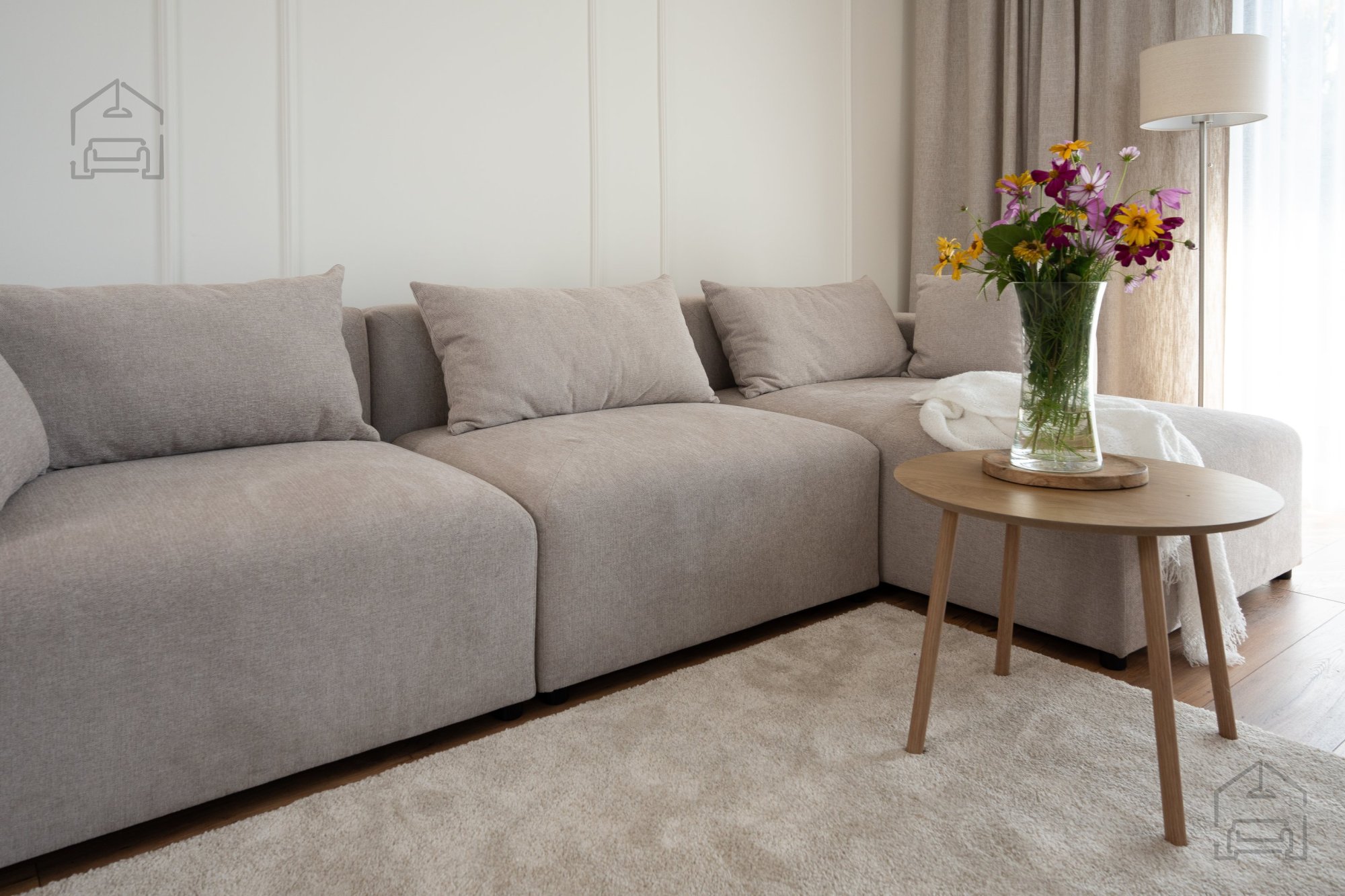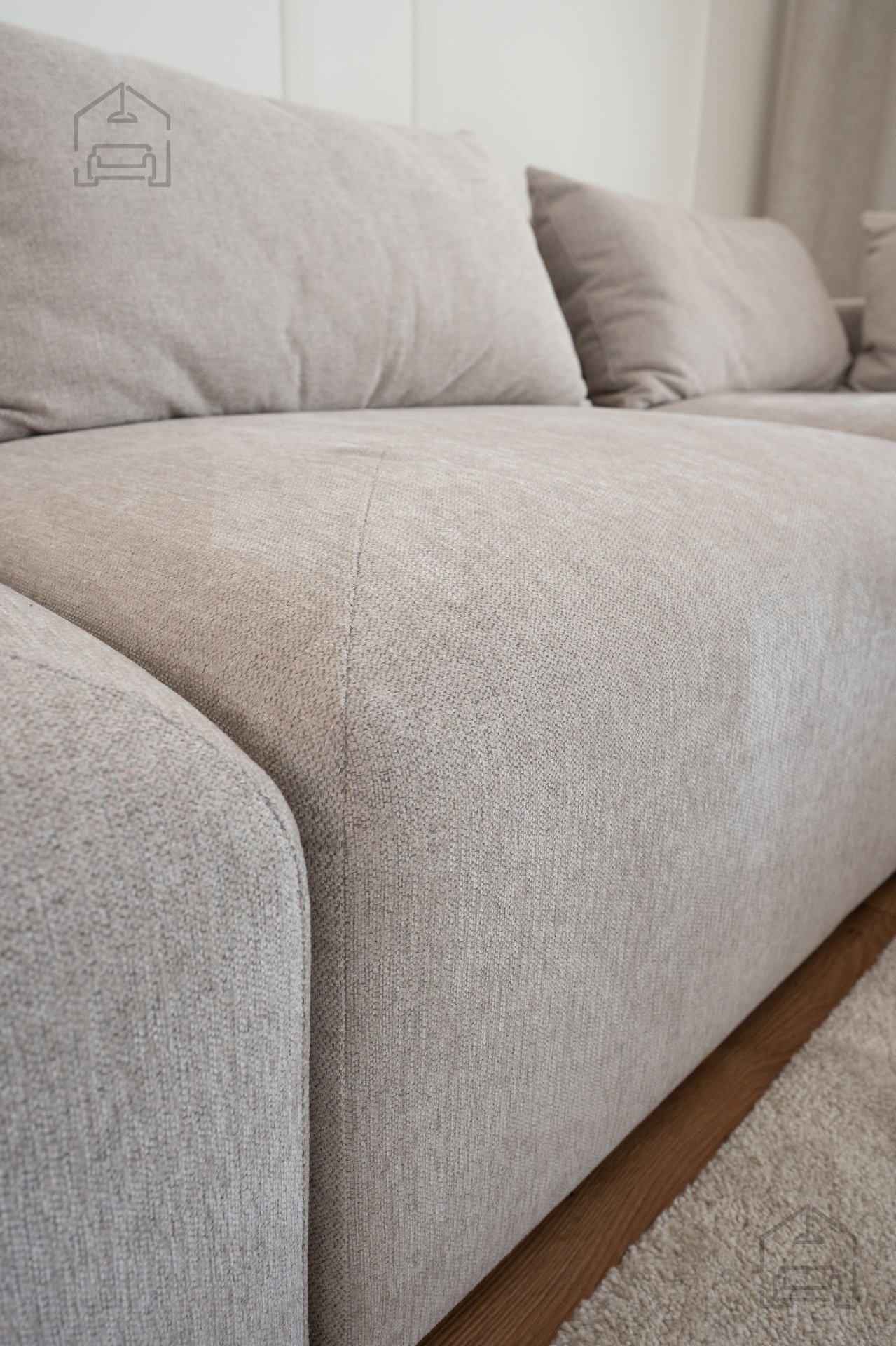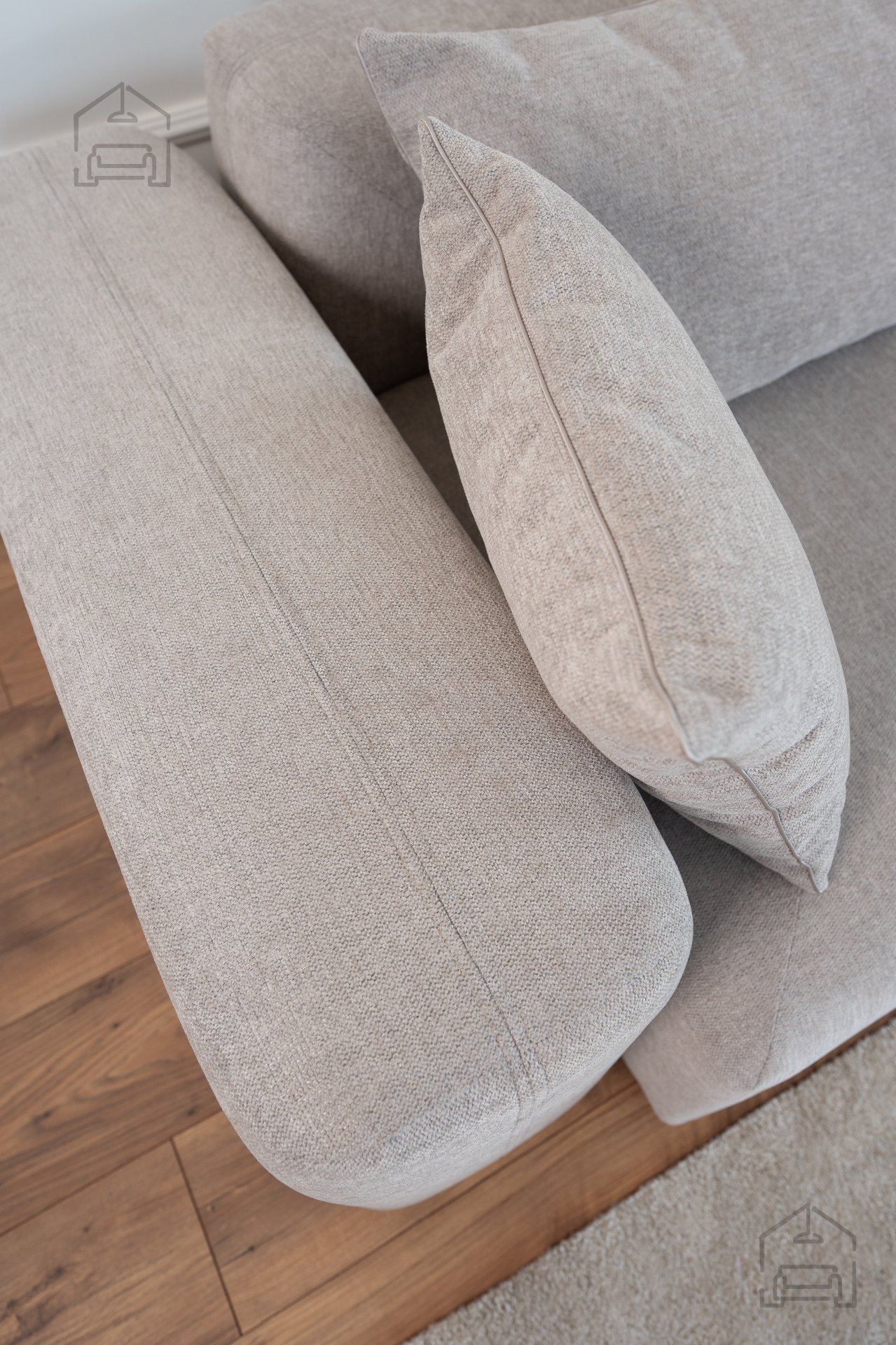 Die Form der Garnitur ist elegant, mit sanft abgerundeten Kanten, was einen angenehmen visuellen Effekt schafft und eine einfache Integration in verschiedene Einrichtungsstile ermöglicht. Die gepolsterte Rückseite erlaubt es, das Sofa auch in der Raummitte und nicht nur an der Wand zu platzieren.