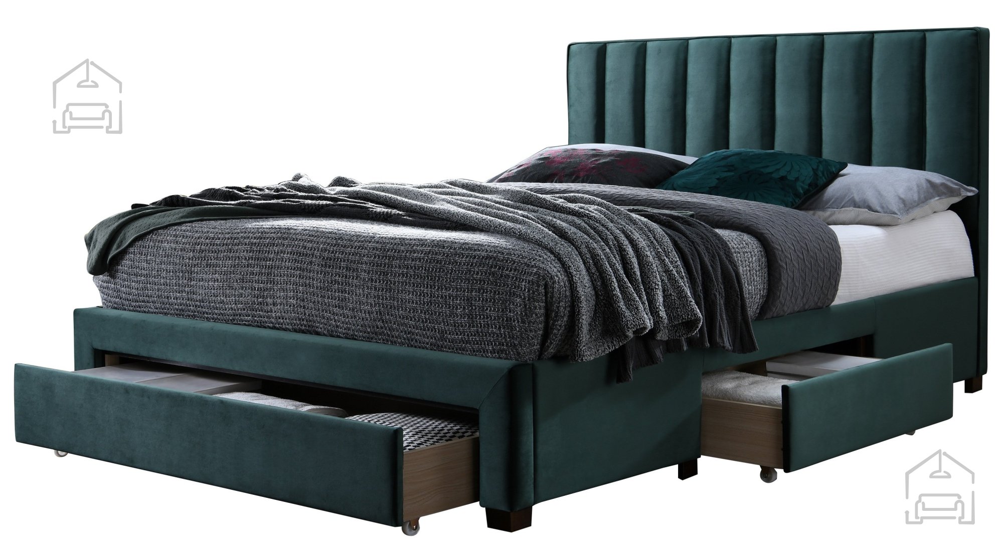 Das Bett Grace – Halmar in grüner Samtausführung vereint hochwertige Verarbeitung, praktische Funktionen und ästhetische Vollkommenheit. Seine sorgfältig gewählten Abmessungen, die stabile Holzbasis und das angenehme Samterscheinungsbild schaffen ein perfektes Gleichgewicht zwischen Komfort und Eleganz. Hergestellt in Polen in der Fabrik Halmar, stellt dieses Modell eine zuverlässige Wahl für alle dar, die ihrem Schlafzimmer einen Hauch von Luxus und Ordnung verleihen möchten.