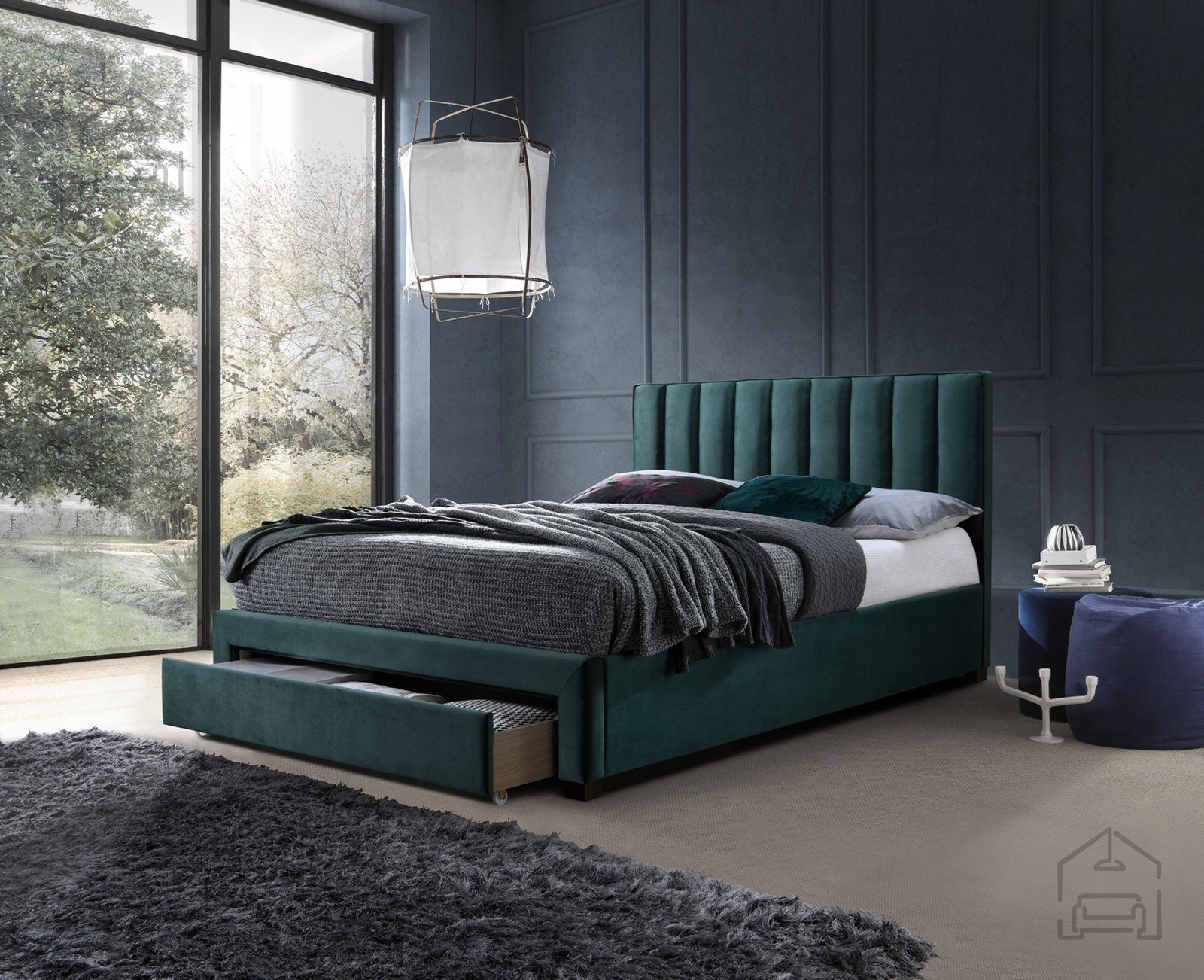 Das Bett Grace – Halmar ist mit Blick auf täglichen Komfort und Ästhetik entworfen. Seine Samtoberfläche ist angenehm zu berühren und leicht zu pflegen, zugleich wirkt sie als zentrales dekoratives Element des Schlafzimmers. Der grüne Samt vermittelt ein Gefühl von Frische, während das massive Holz eine natürliche Note und Wärme hinzufügt. Diese Kombination schafft ein ausgewogenes Erscheinungsbild, das gut mit hellen oder dunklen Tönen der Inneneinrichtung harmoniert.
