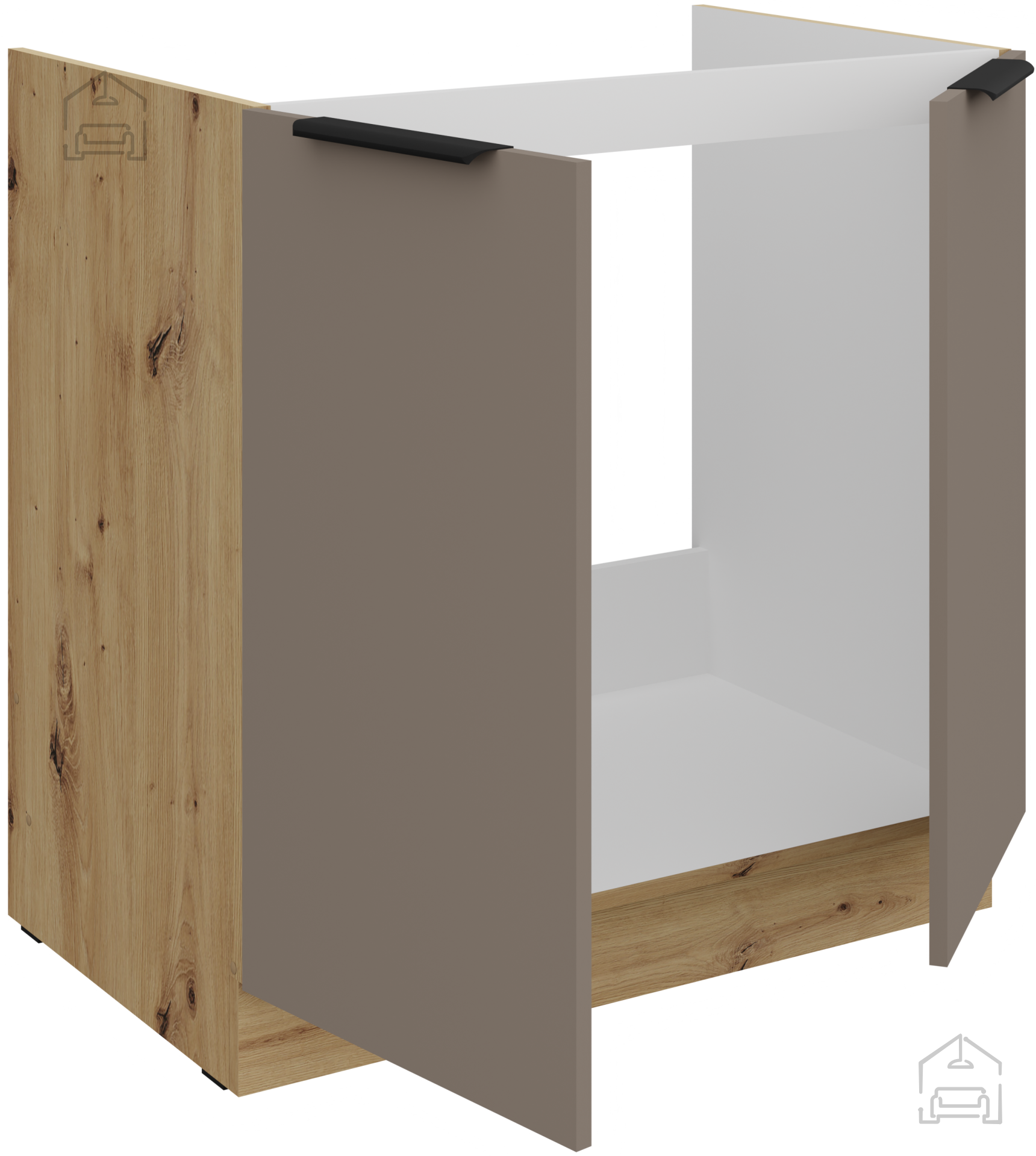 Das Grundmaterial des Küchenensembles Aria ist eine laminierte Platte mit einer Stärke von 16 mm, die sich durch hervorragende Stabilität und Abriebfestigkeit auszeichnet. Die Oberfläche in der Nuance Sandgrau/Artisan Eiche vereint moderne Grautöne und die Wärme von natürlichem Holz, was einen ausgewogenen ästhetischen Eindruck schafft. Die Kanten sind präzise bearbeitet und geschützt, was zusätzlich zur Haltbarkeit der Elemente beiträgt. Der Rahmen besteht aus Spanplatte, die strukturelle Stabilität und ästhetische Vollendung des Ganzen gewährleistet.