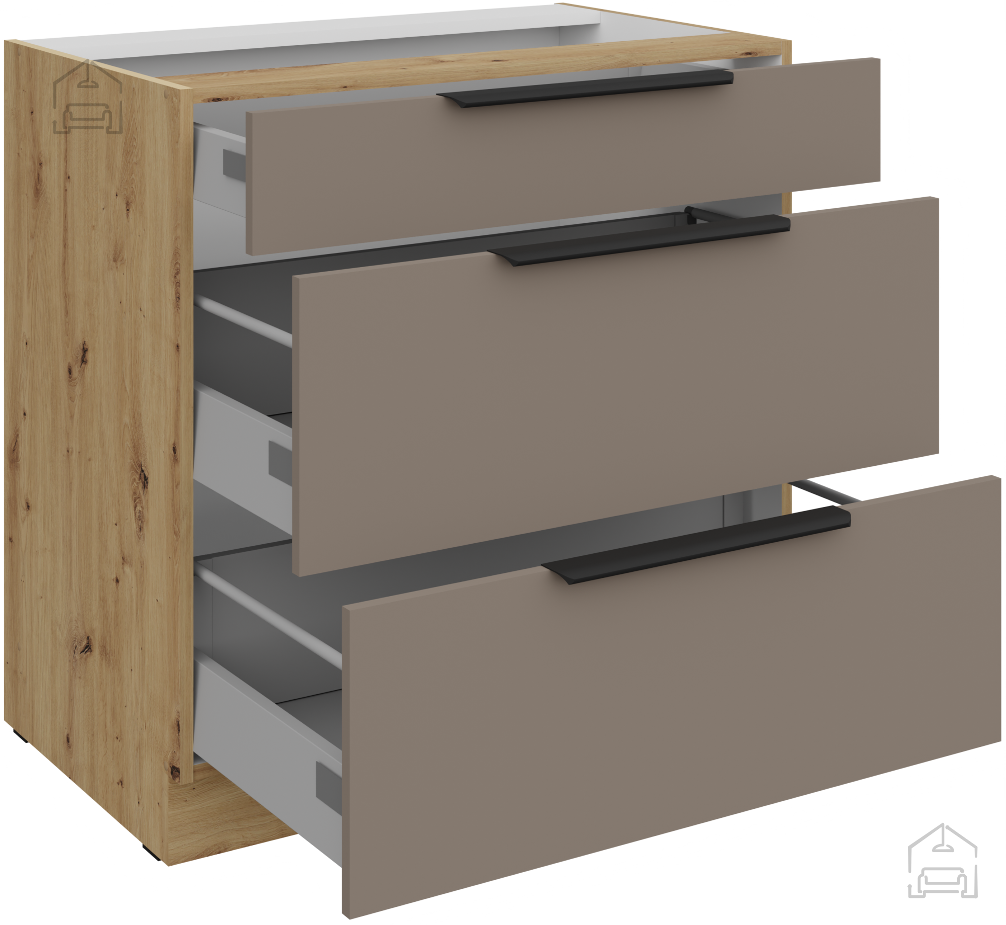 Das Grundmaterial des Küchenensembles Aria ist eine laminierte Platte mit einer Stärke von 16 mm, die sich durch hervorragende Stabilität und Abriebfestigkeit auszeichnet. Die Oberfläche im Farbton Sandgrau/Artisan Eiche vereint moderne Grautöne und die Wärme von natürlichem Holz, wodurch ein ausgewogener ästhetischer Eindruck entsteht. Die Kanten sind präzise bearbeitet und geschützt, was zusätzlich zur Haltbarkeit der Elemente beiträgt. Der Rahmen besteht aus Spanplatte, die strukturelle Stabilität und ästhetische Vollendung des Ganzen gewährleistet.