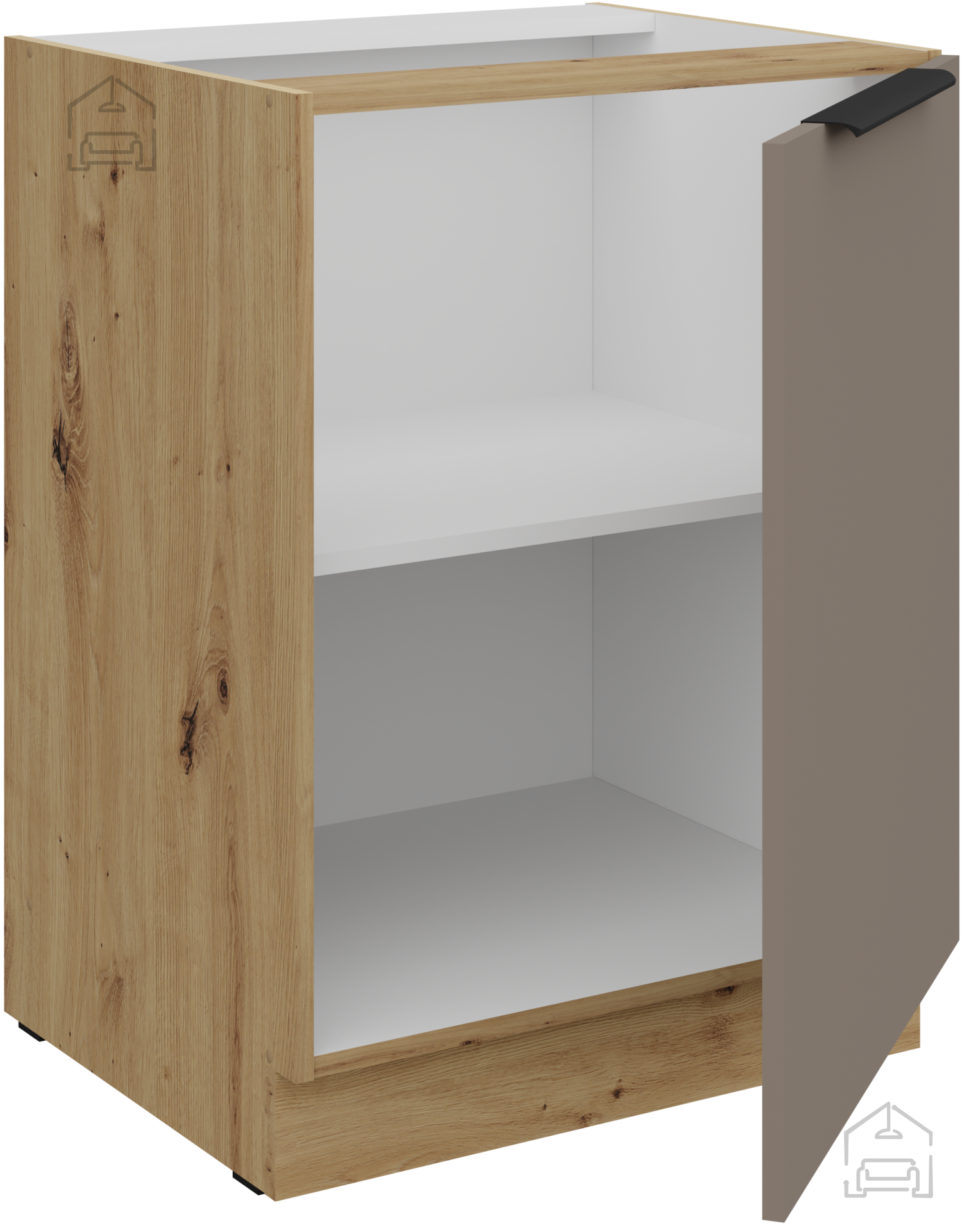 Das Basismaterial des Küchenensembles Aria ist eine laminierte Platte mit einer Stärke von 16 mm, die sich durch hervorragende Stabilität und Abriebfestigkeit auszeichnet. Die Oberfläche im Farbton Sandgrau/Eiche Artisan vereint moderne Grautöne und die Wärme von natürlichem Holz, was einen ausgewogenen ästhetischen Eindruck schafft. Die Kanten sind präzise bearbeitet und geschützt, was zusätzlich zur Haltbarkeit der Elemente beiträgt. Der Rahmen besteht aus Spanplatte, die strukturelle Stabilität und ästhetische Vollkommenheit des Ganzen gewährleistet.