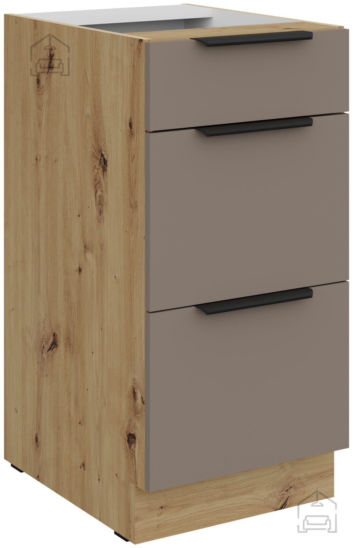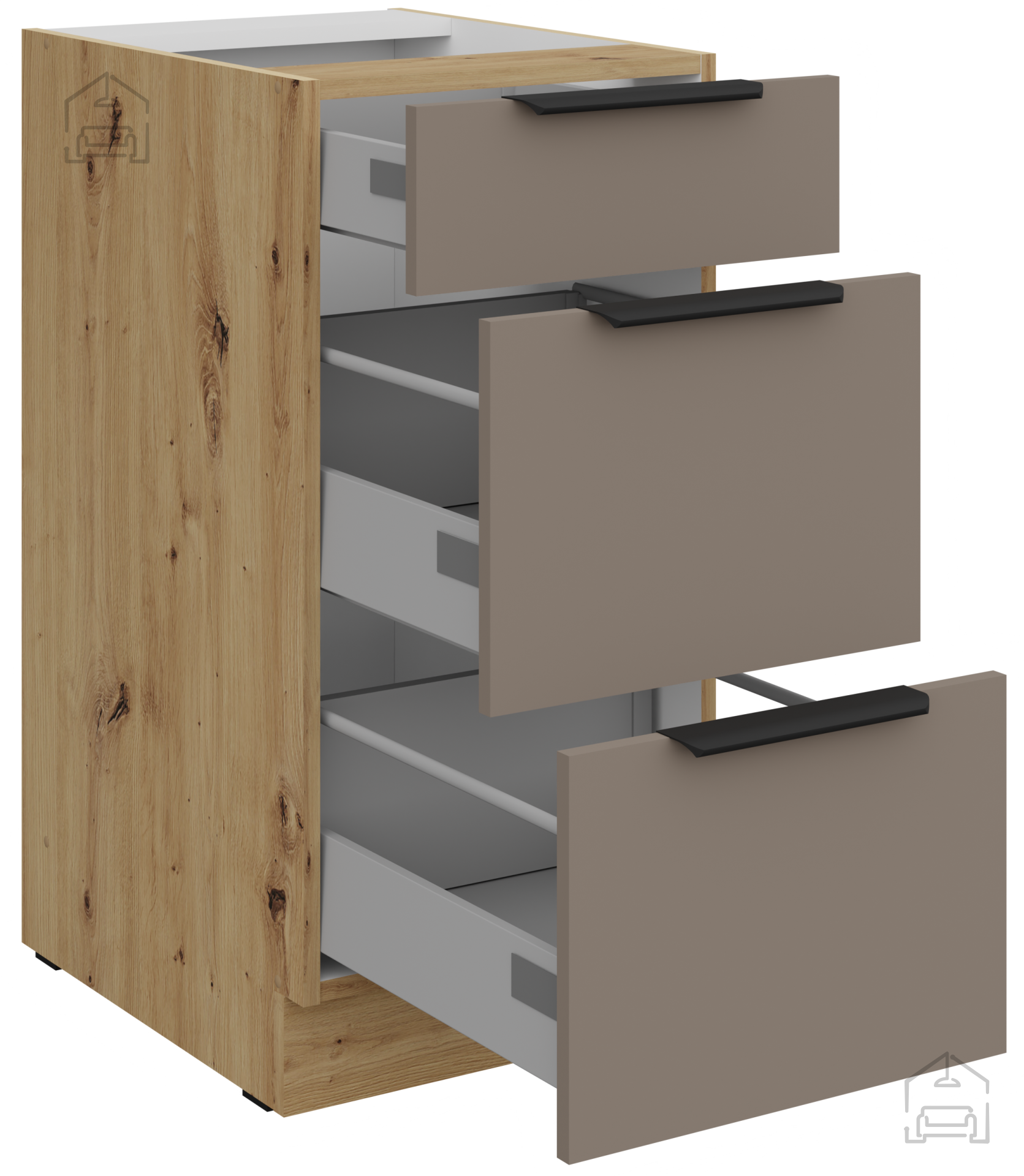 Das Basismaterial des Küchenprogramms Aria ist eine laminierte Platte mit einer Stärke von 16 mm, die sich durch hervorragende Stabilität und Abriebfestigkeit auszeichnet. Die Oberfläche im Farbton Sandgrau/Eiche Artisan vereint moderne Grautöne mit der Wärme von natürlichem Holz und schafft so einen ausgewogenen ästhetischen Eindruck. Die Kanten sind präzise bearbeitet und geschützt, was zusätzlich zur Haltbarkeit der Elemente beiträgt. Der Rahmen besteht aus Spanplatte, die strukturelle Stabilität und ästhetische Vollendung des Ganzen gewährleistet.