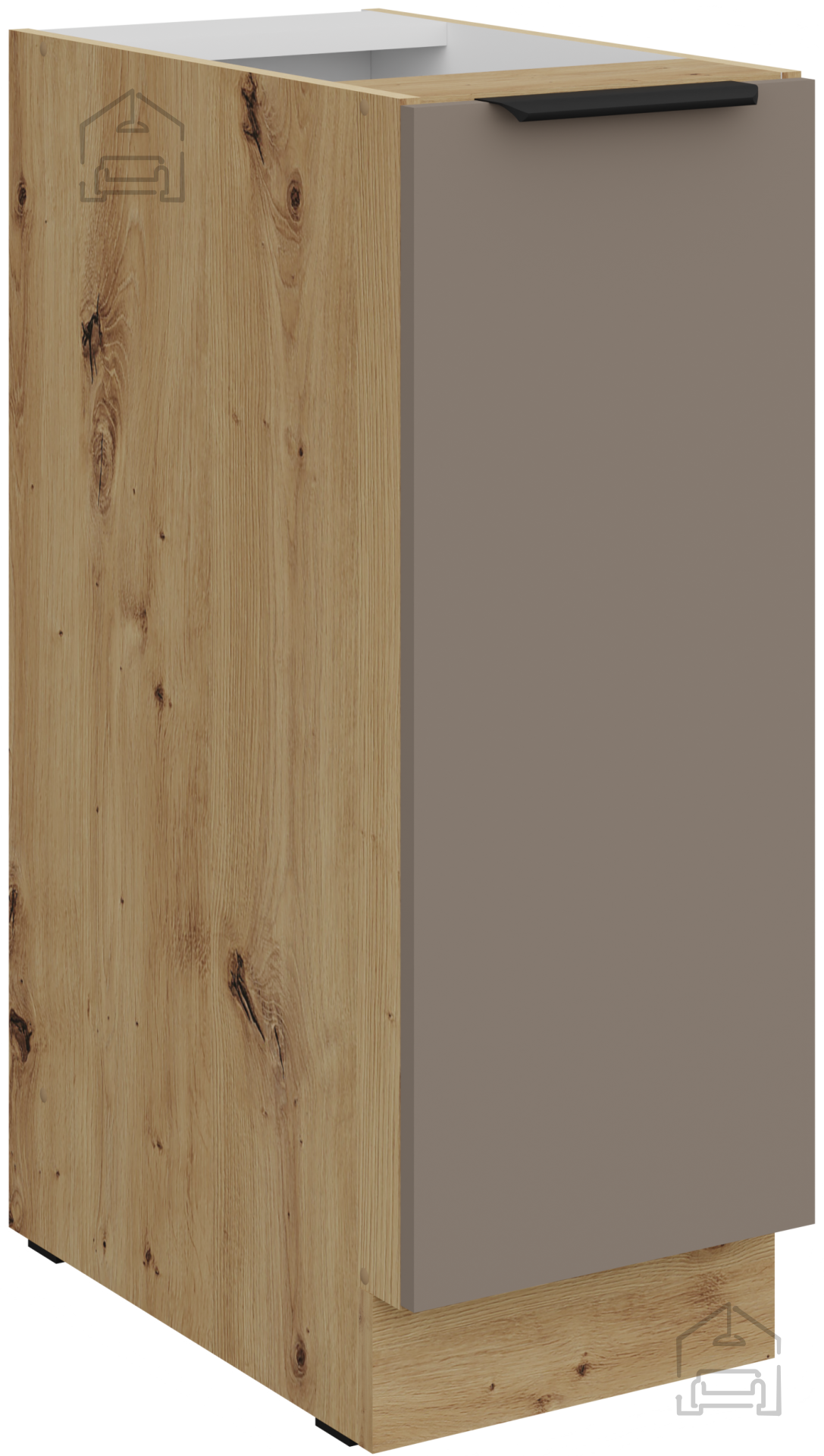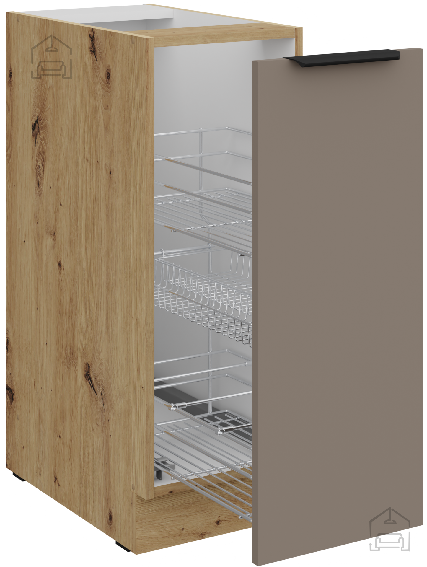Das Grundmaterial des Küchenmöbel-Sets Aria ist eine laminierte Platte mit einer Stärke von 16 mm, die sich durch hervorragende Stabilität und Abriebfestigkeit auszeichnet. Die Oberfläche im Farbton Sandgrau/Eiche Artisan vereint moderne Grautöne und die Wärme von natürlichem Holz, was einen ausgewogenen ästhetischen Eindruck schafft. Die Kanten sind präzise bearbeitet und geschützt, was zusätzlich zur Langlebigkeit der Elemente beiträgt. Der Rahmen besteht aus Spanplatte, die strukturelle Stabilität und ästhetische Vollendung des Ganzen gewährleistet.