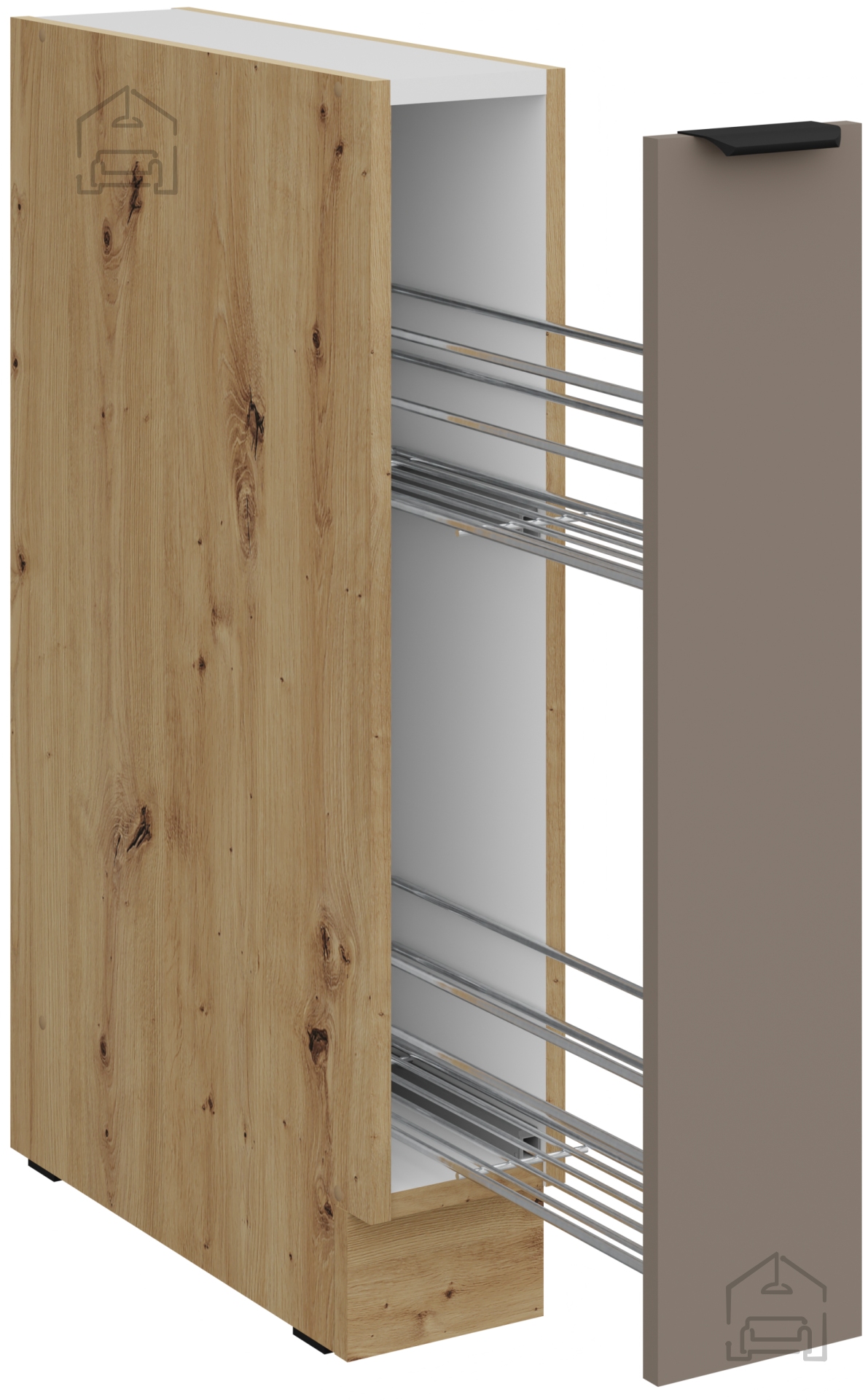 Das Grundmaterial der Küchenzeile Aria ist eine laminierte Platte mit einer Stärke von 16 mm, die sich durch hervorragende Stabilität und Abriebfestigkeit auszeichnet. Die Oberfläche im Farbton sandgrau/artisan Eiche vereint moderne Grautöne und die Wärme von natürlichem Holz, was einen ausgewogenen ästhetischen Eindruck schafft. Die Kanten sind präzise bearbeitet und geschützt, was zusätzlich zur Haltbarkeit der Elemente beiträgt. Der Rahmen besteht aus Spanplatte, die strukturelle Stabilität und ästhetische Vollendung des Ganzen gewährleistet.