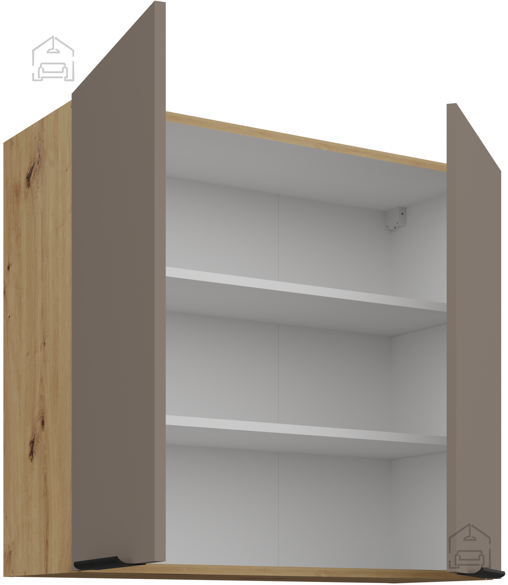 Das Grundmaterial der Küchenzeile Aria ist eine laminierte Platte mit einer Stärke von 16 mm, die sich durch hervorragende Stabilität und Abriebfestigkeit auszeichnet. Die Oberfläche im Farbton Sandgrau/Artisan Eiche kombiniert modernes Grau und die Wärme von natürlichem Holz, was einen ausgewogenen ästhetischen Eindruck schafft. Die Kanten sind präzise bearbeitet und geschützt, was zusätzlich zur Haltbarkeit der Elemente beiträgt. Der Rahmen besteht aus Spanplatte, die strukturelle Stabilität und ästhetische Vollendung des Ganzen gewährleistet.
