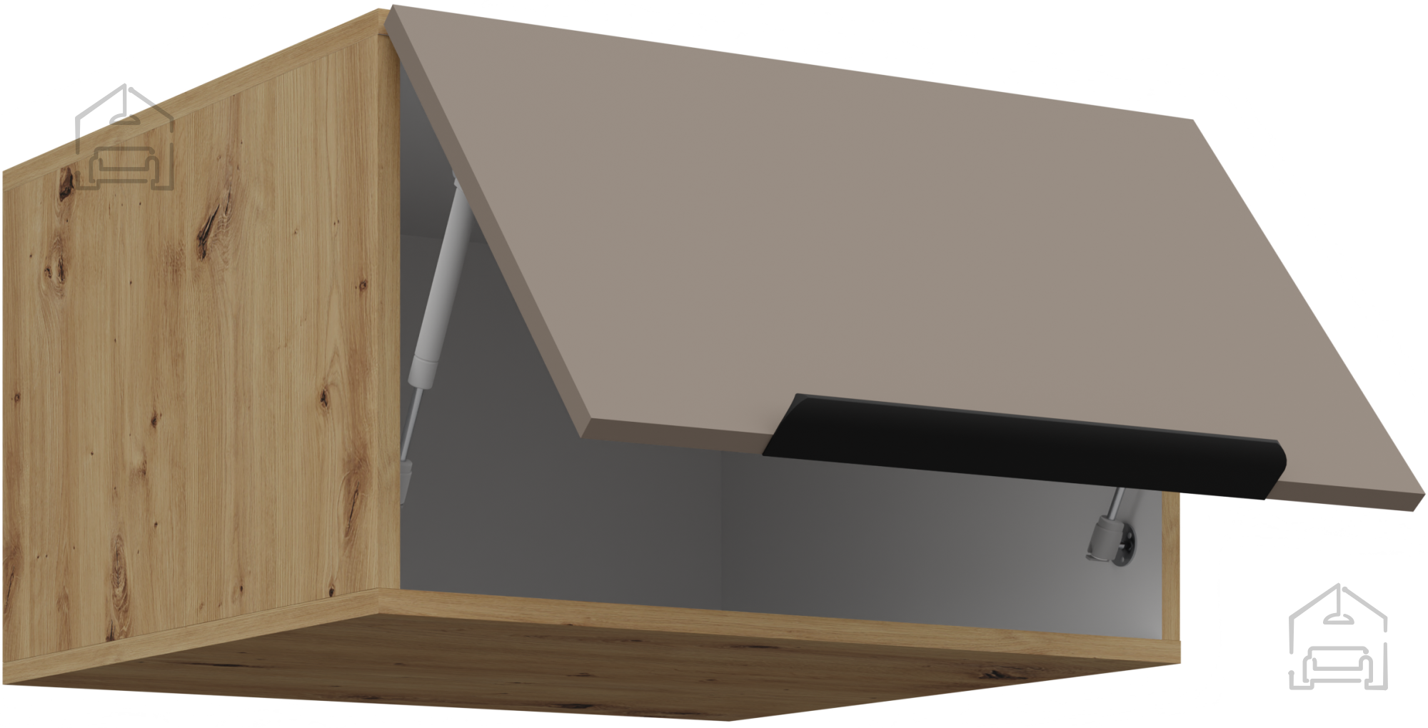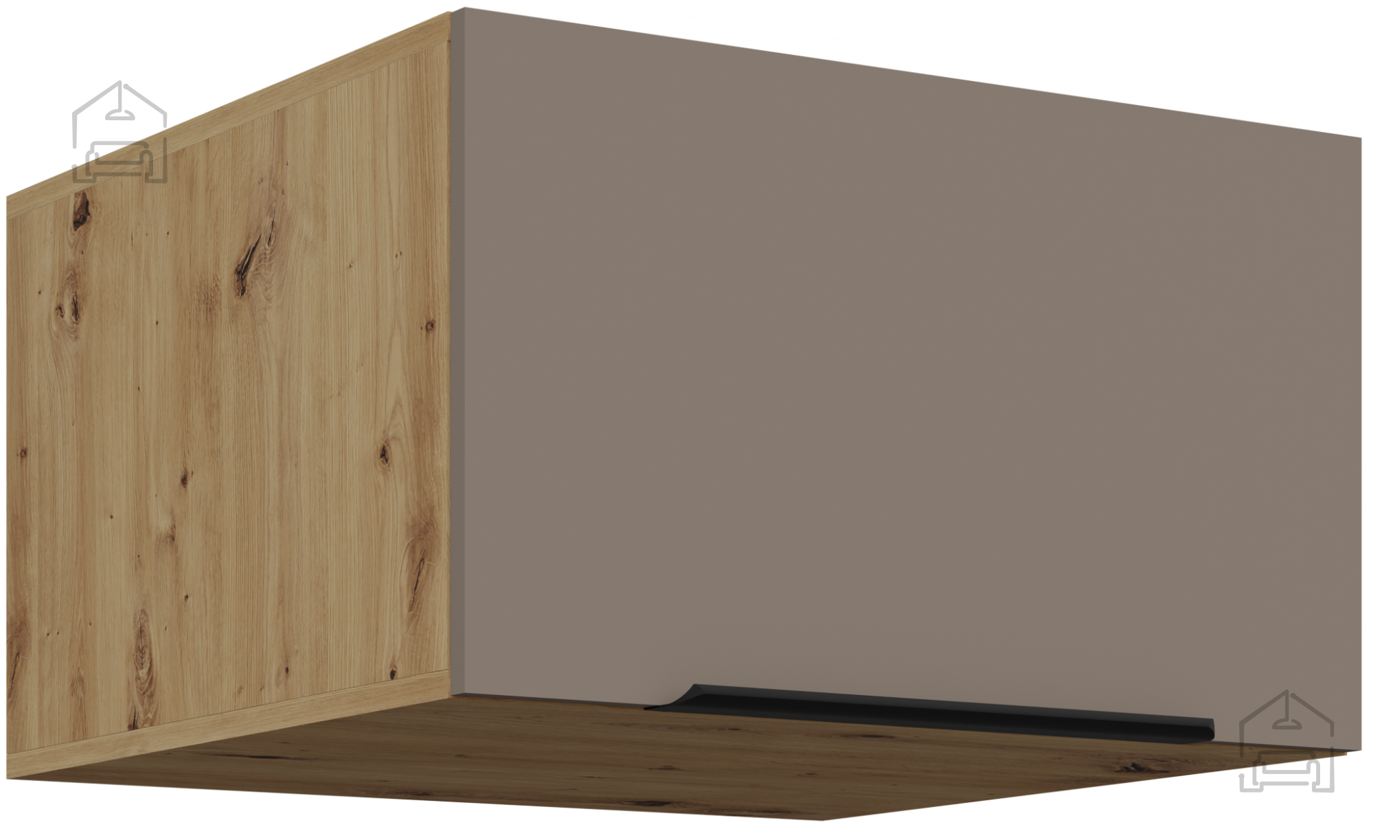Die Kombination der Farbtöne Kaschmir, Sandgrau und Artisan Eiche schafft einen angenehmen visuellen Kontrast, der dem Raum Wärme und Eleganz verleiht. Eine solche Farbkombination ist besonders in modernen Interieurs beliebt, in denen eine ruhige Palette natürlicher Töne vorherrscht. Die Oberflächen sind pflegeleicht – regelmäßiges Wischen mit einem weichen Tuch und mildem Reinigungsmittel genügt, damit die Küche ihr Aussehen über Jahre hinweg behält.