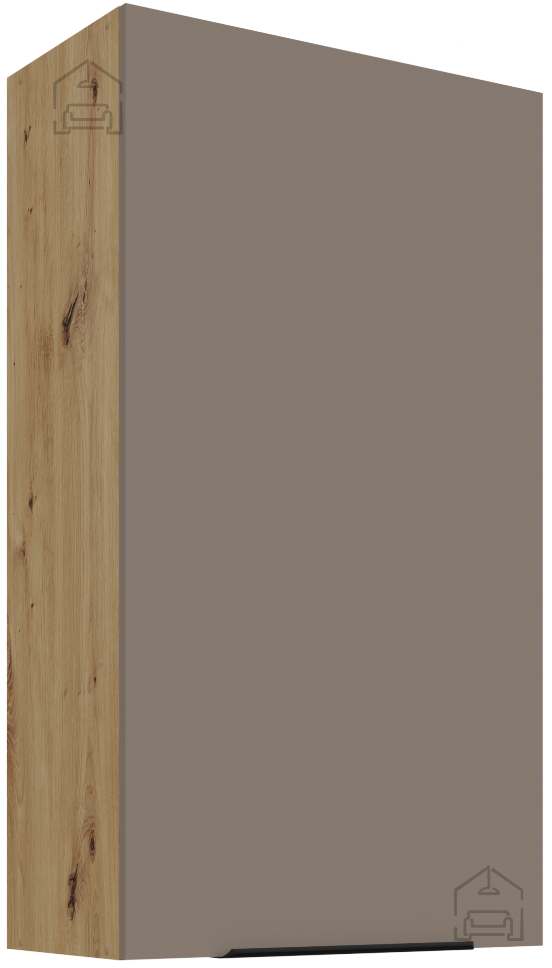 Das Grundmaterial der Küchenzeile Aria ist eine laminierte Platte mit einer Stärke von 16 mm, die sich durch hervorragende Stabilität und Abriebfestigkeit auszeichnet. Die Oberfläche im Farbton Sandgrau/Eiche Artisan vereint modernes Grau mit der Wärme von natürlichem Holz und schafft so einen ausgewogenen ästhetischen Eindruck. Die Kanten sind präzise bearbeitet und geschützt, was zusätzlich zur Langlebigkeit der Elemente beiträgt. Der Rahmen besteht aus Spanplatte, die strukturelle Stabilität und ästhetische Vollendung des Ganzen gewährleistet.