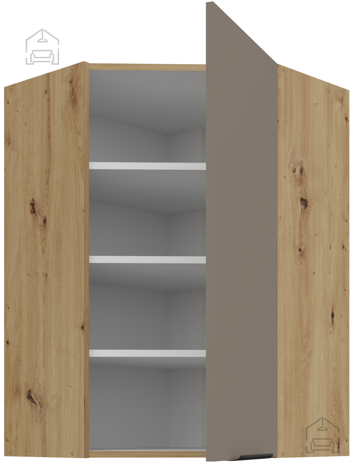 Das Grundmaterial des Küchenensembles Aria ist eine laminierte Platte mit einer Stärke von 16 mm, die sich durch hervorragende Stabilität und Abriebfestigkeit auszeichnet. Die Oberfläche im Farbton Sandgrau/Artisan-Eiche vereint moderne Grautöne und die Wärme von Naturholz, was einen ausgewogenen ästhetischen Eindruck schafft. Die Kanten sind präzise bearbeitet und geschützt, was zusätzlich zur Haltbarkeit der Elemente beiträgt. Der Rahmen besteht aus Spanplatte, die strukturelle Stabilität und ästhetische Vollendung des Ganzen gewährleistet.