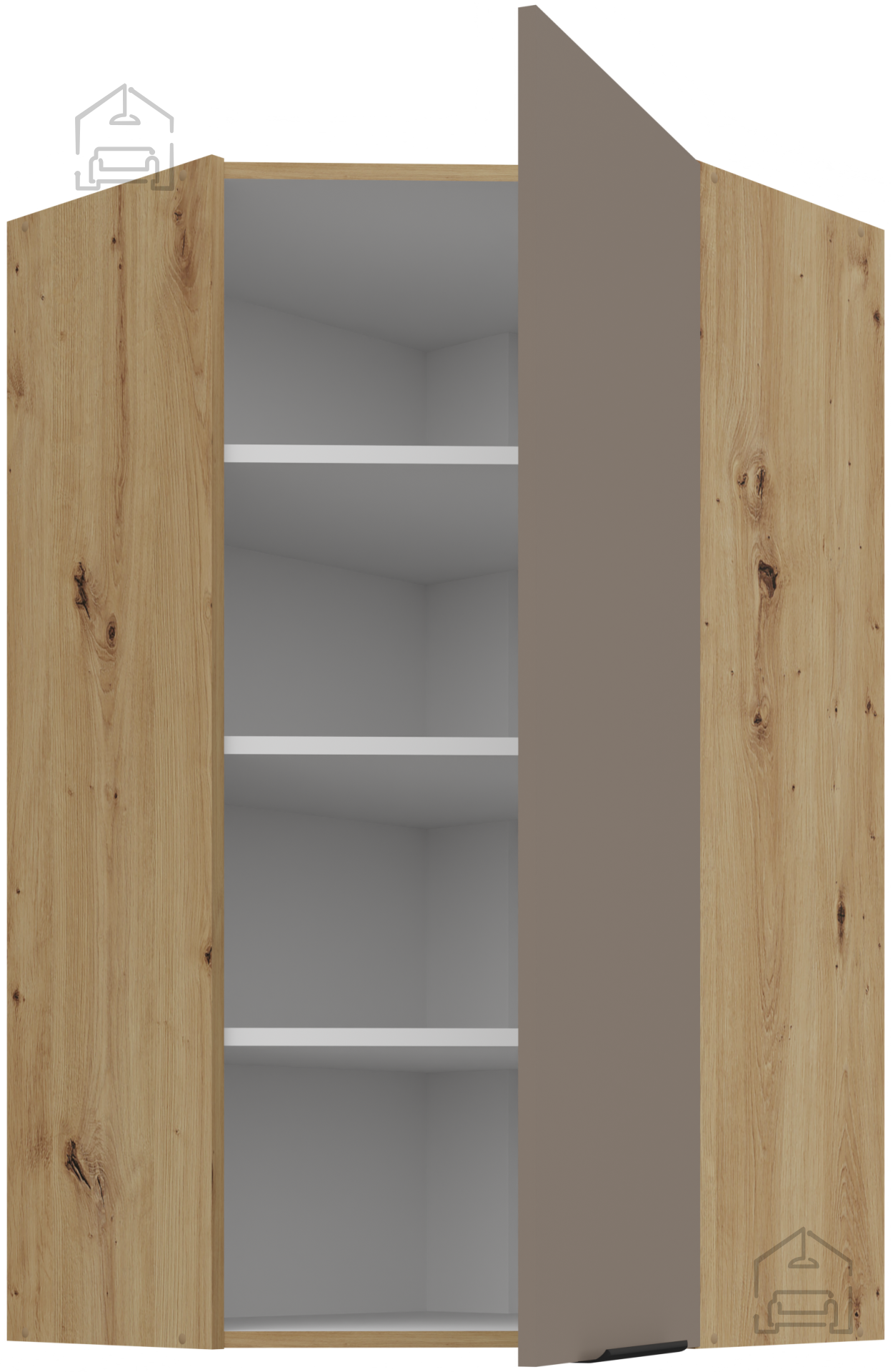 Das Grundmaterial der Küchenzeile Aria ist eine laminierte Platte mit einer Stärke von 16 mm, die sich durch hervorragende Stabilität und Abriebfestigkeit auszeichnet. Die Oberfläche im Farbton Sandgrau/Artisan Eiche vereint moderne Grautöne mit der Wärme von natürlichem Holz und schafft so einen ausgewogenen ästhetischen Eindruck. Die Kanten sind präzise bearbeitet und geschützt, was zusätzlich zur Langlebigkeit der Elemente beiträgt. Der Rahmen besteht aus Spanplatte, die strukturelle Stabilität und ästhetische Vollendung des Ganzen gewährleistet.