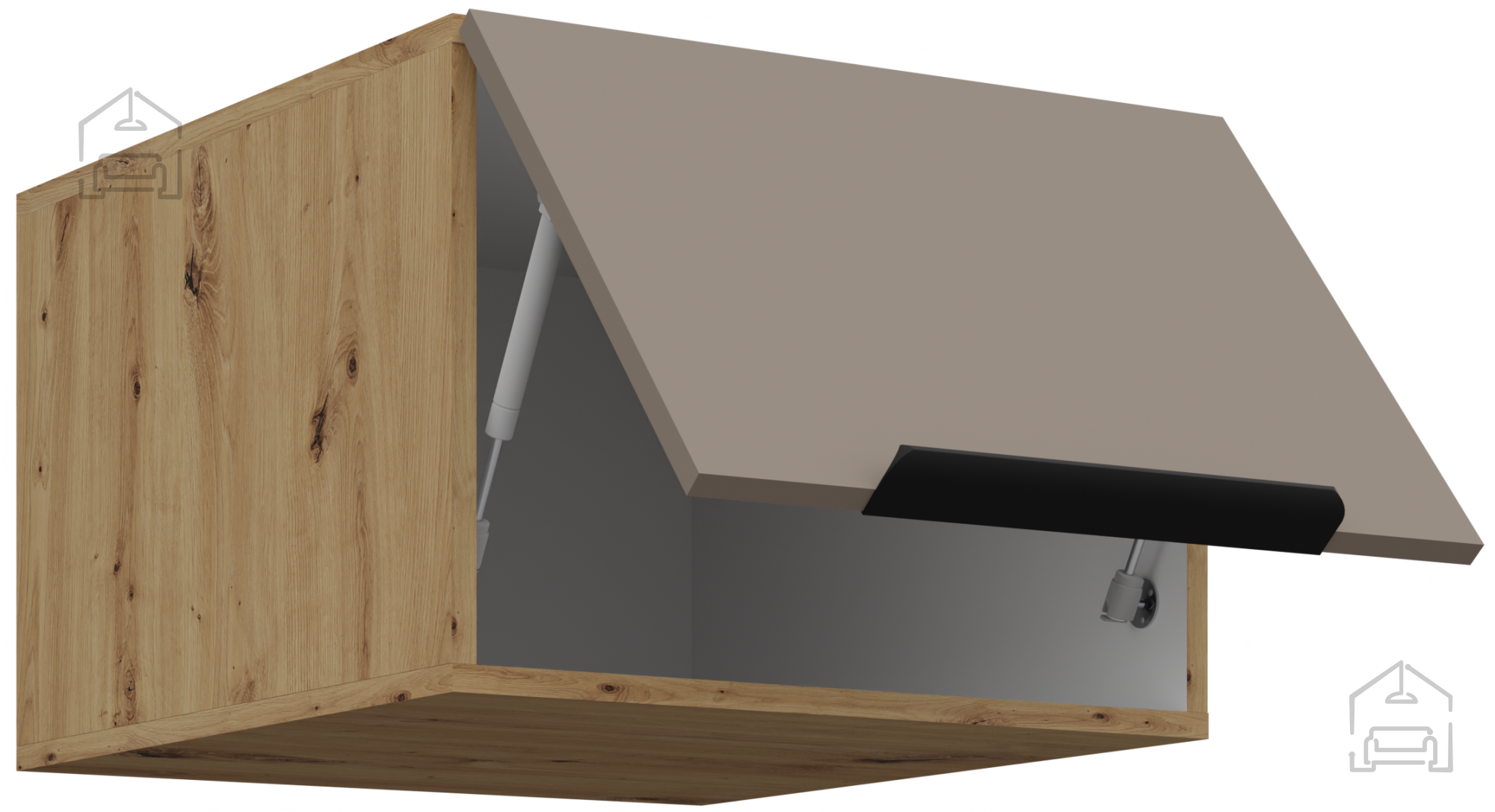 Das Grundmaterial der Küchenzeile Aria ist eine laminierte Platte mit einer Stärke von 16 mm, die sich durch hervorragende Stabilität und Abriebfestigkeit auszeichnet. Die Oberfläche im Farbton Sandgrau/Eiche Artisan vereint moderne Grautöne und die Wärme von Naturholz, was einen ausgewogenen ästhetischen Eindruck schafft. Die Kanten sind präzise bearbeitet und geschützt, was zusätzlich zur Langlebigkeit der Elemente beiträgt. Der Rahmen besteht aus Spanplatte, die strukturelle Stabilität und ästhetische Vollendung des Ganzen gewährleistet.