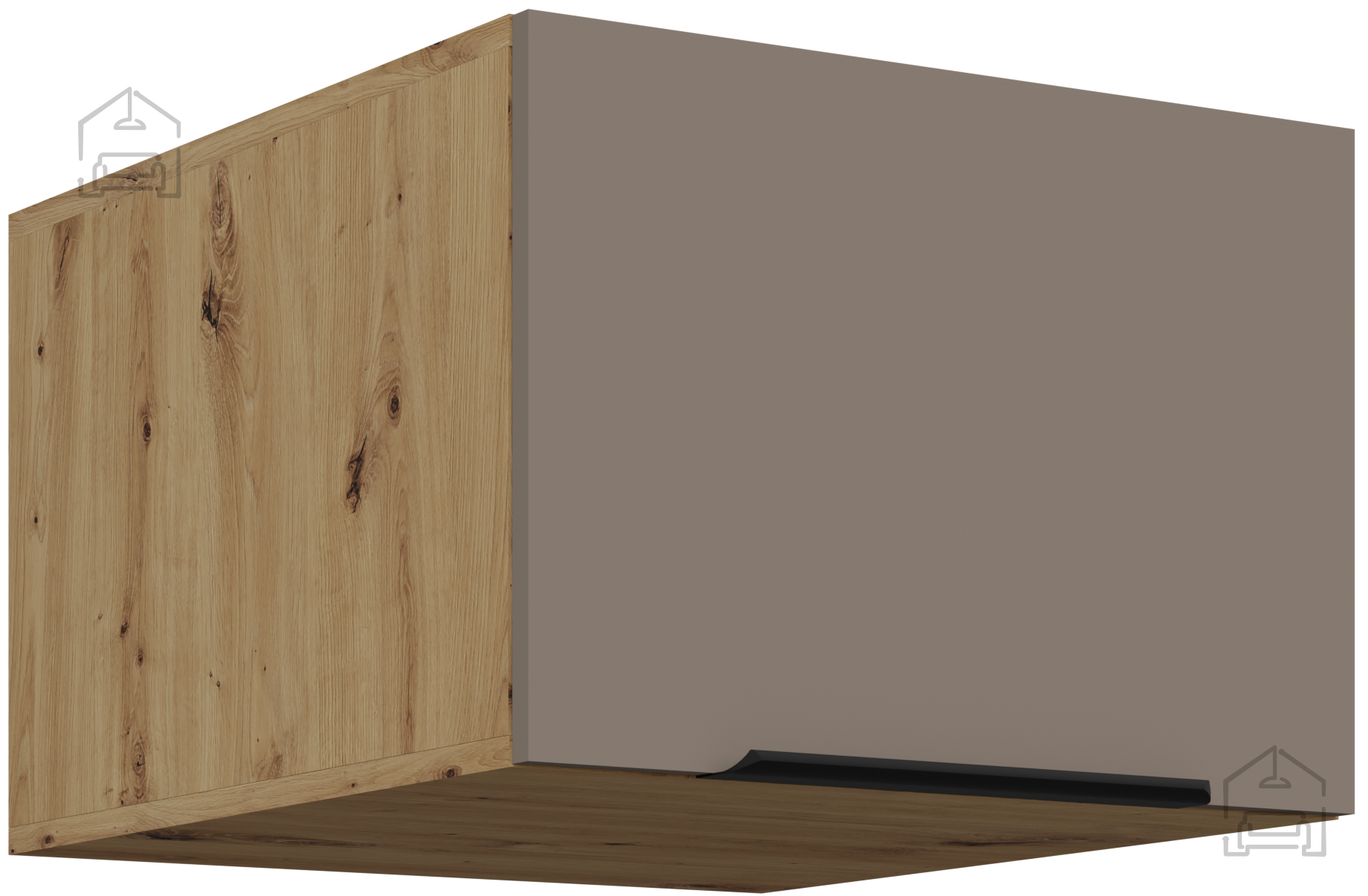 Die Kombination der Farbtöne Kaschmir, Sandgrau und Eiche Artisan schafft einen angenehmen visuellen Kontrast, der dem Raum Wärme und Eleganz verleiht. Eine solche Farbkomposition ist besonders beliebt in modernen Interieurs, in denen eine ruhige Palette natürlicher Töne vorherrscht. Die Oberflächen sind pflegeleicht – regelmäßiges Wischen mit einem weichen Tuch und mildem Reinigungsmittel genügt, damit die Küche über Jahre hinweg ihr Aussehen behält.