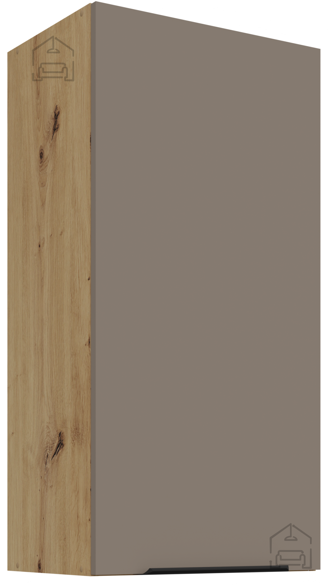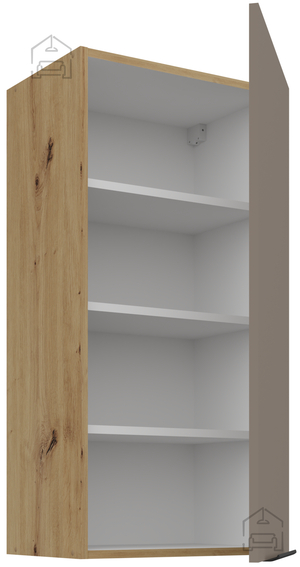 Die Kombination der Farbtöne Kaschmir, Sandgrau und Eiche Artisan schafft einen angenehmen visuellen Kontrast, der dem Raum Wärme und Eleganz verleiht. Eine solche Farbkomposition ist besonders beliebt in modernen Interieurs, in denen eine ruhige Palette natürlicher Töne vorherrscht. Die Oberflächen sind pflegeleicht – regelmäßiges Abwischen mit einem weichen Tuch und mildem Reinigungsmittel reicht aus, damit die Küche ihr Aussehen über Jahre hinweg behält.